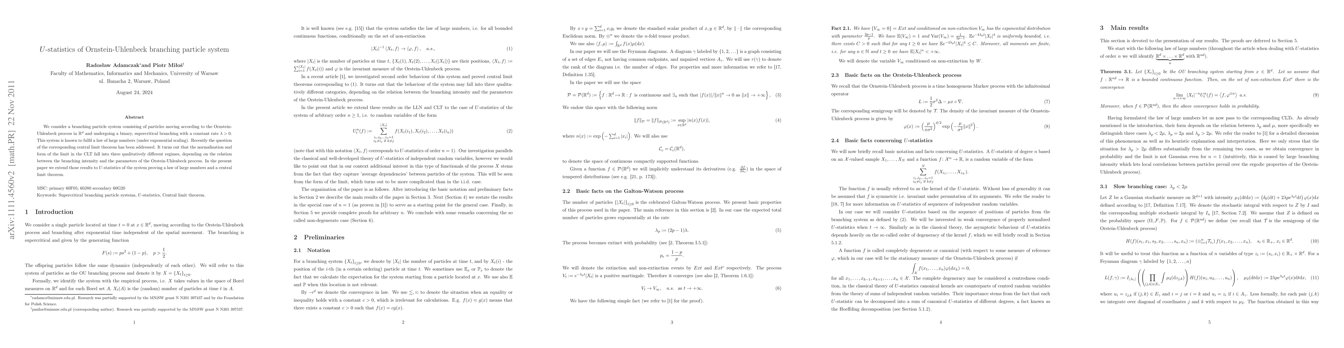 This paper investigates the U-statistics of a branching particle system driven by an Ornstein-Uhlenbeck process, establishing a law of large numbers and a central limit theorem across three distinct regimes based on the relationship between the branching intensity and the process parameters.