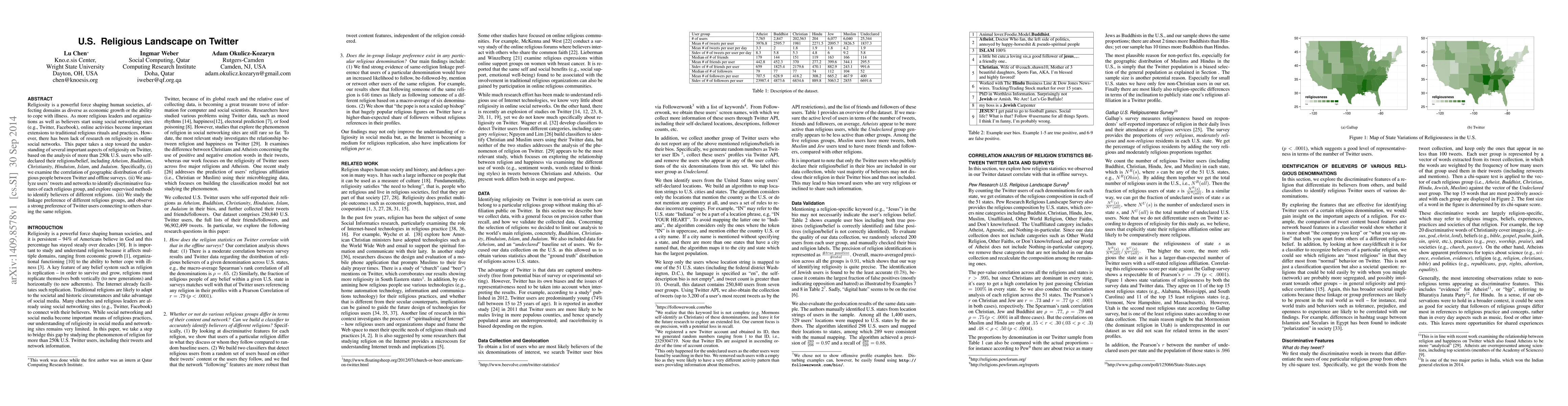 Religiosity is a powerful force shaping human societies, affecting domains as diverse as economic growth or the ability to cope with illness. As more religious leaders and organizations as well as believers start using social networking sites (e.g., Twitter, Facebook), online activities become important extensions to traditional religious rituals and practices. However, there has been lack of research on religiosity in online social networks. This paper takes a step toward the understanding of several important aspects of religiosity on Twitter, based on the analysis of more than 250k U.S. users who self-declared their religions/belief, including Atheism, Buddhism, Christianity, Hinduism, Islam, and Judaism. Specifically, (i) we examine the correlation of geographic distribution of religious people between Twitter and offline surveys. (ii) We analyze users' tweets and networks to identify discriminative features of each religious group, and explore supervised methods to identify believers of different religions. (iii) We study the linkage preference of different religious groups, and observe a strong preference of Twitter users connecting to others sharing the same religion.