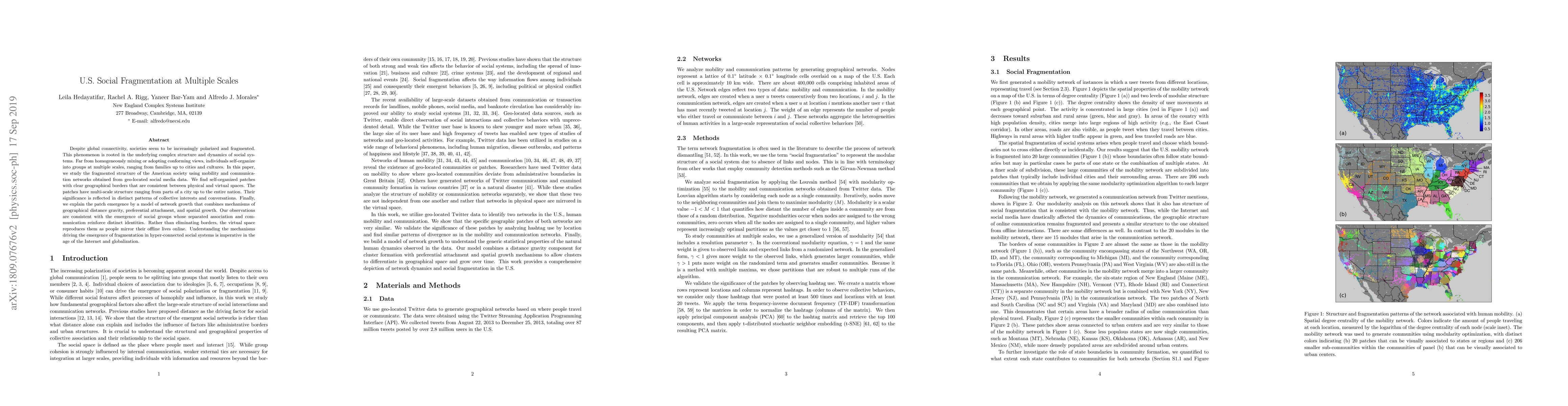 Despite global connectivity, societies seem to be increasingly polarized and fragmented. This phenomenon is rooted in the underlying complex structure and dynamics of social systems. Far from homogeneously mixing or adopting conforming views, individuals self-organize into groups at multiple scales, ranging from families up to cities and cultures. In this paper, we study the fragmented structure of the American society using mobility and communication networks obtained from geo-located social media data. We find self-organized patches with clear geographical borders that are consistent between physical and virtual spaces. The patches have multi-scale structure ranging from parts of a city up to the entire nation. Their significance is reflected in distinct patterns of collective interests and conversations. Finally, we explain the patch emergence by a model of network growth that combines mechanisms of geographical distance gravity, preferential attachment, and spatial growth. Our observations are consistent with the emergence of social groups whose separated association and communication reinforce distinct identities. Rather than eliminating borders, the virtual space reproduces them as people mirror their offline lives online. Understanding the mechanisms driving the emergence of fragmentation in hyper-connected social systems is imperative in the age of the Internet and globalization.