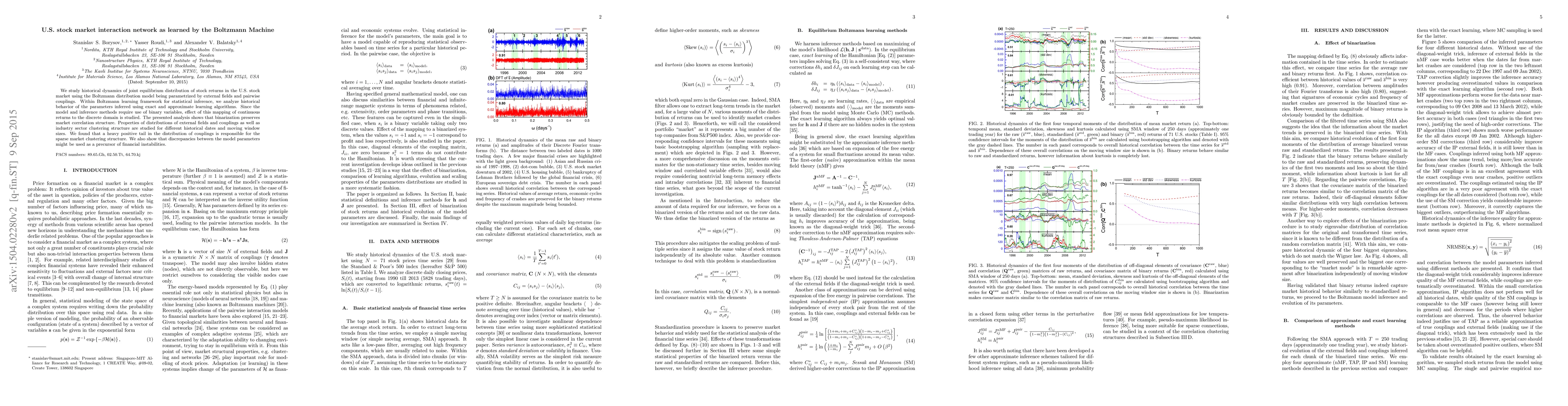 We study historical dynamics of joint equilibrium distribution of stock returns in the U.S. stock market using the Boltzmann distribution model being parametrized by external fields and pairwise couplings. Within Boltzmann learning framework for statistical inference, we analyze historical behavior of the parameters inferred using exact and approximate learning algorithms. Since the model and inference methods require use of binary variables, effect of this mapping of continuous returns to the discrete domain is studied. The presented analysis shows that binarization preserves market correlation structure. Properties of distributions of external fields and couplings as well as industry sector clustering structure are studied for different historical dates and moving window sizes. We found that a heavy positive tail in the distribution of couplings is responsible for the sparse market clustering structure. We also show that discrepancies between the model parameters might be used as a precursor of financial instabilities.