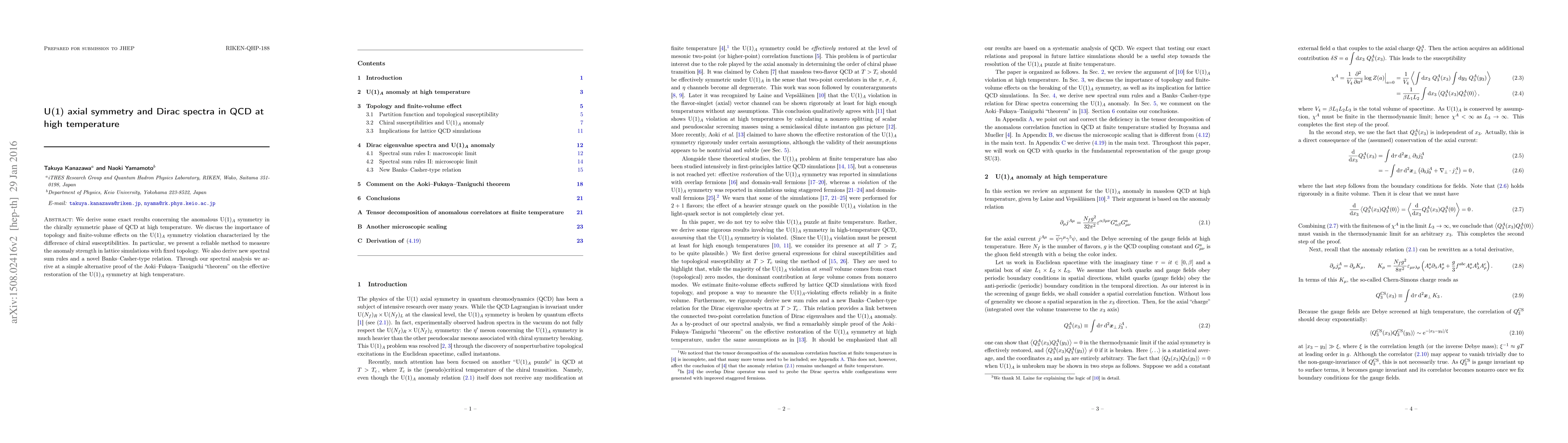 This paper derives exact results on the anomalous U(1)$_A$ symmetry in high-temperature QCD, emphasizing the role of topology and finite-volume effects. It introduces a method for measuring anomaly strength in lattice simulations and provides new spectral sum rules and a Banks-Casher-type relation, ultimately proving the restoration of U(1)$_A$ symmetry at high temperatures.