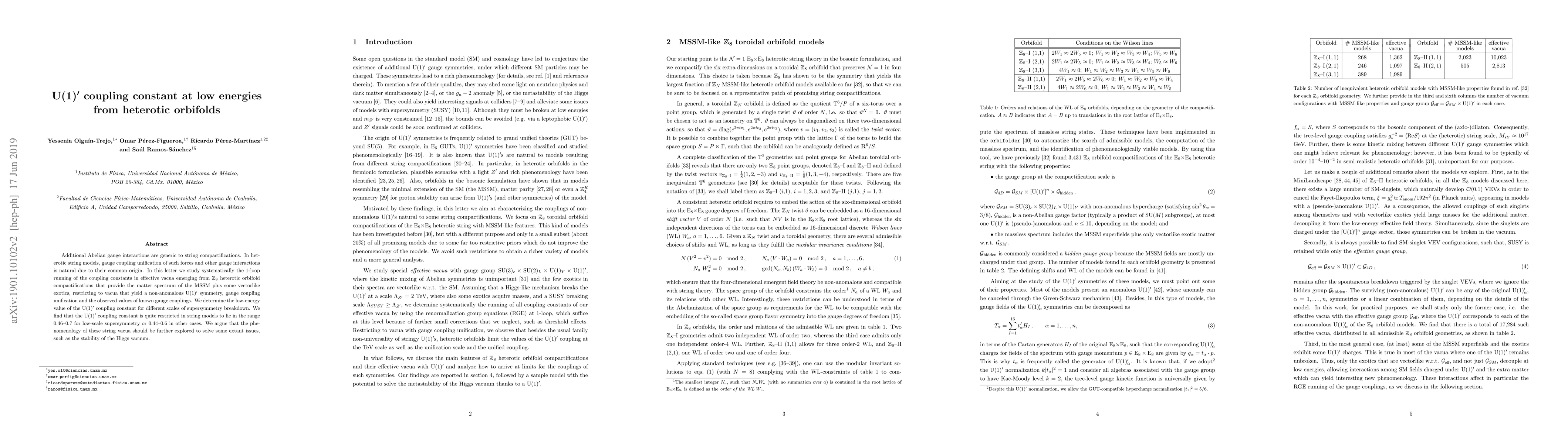 This paper investigates the 1-loop running of coupling constants in heterotic orbifold compactifications of string theory, focusing on the U(1)' gauge interaction. It finds that the U(1)' coupling constant is constrained to a specific range, suggesting potential implications for supersymmetry breakdown scales and the stability of the Higgs vacuum.