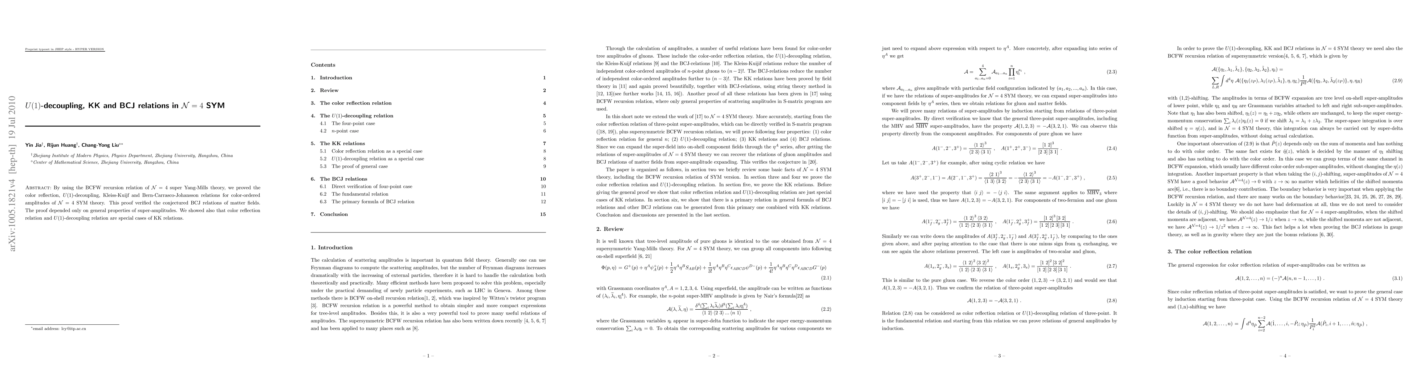 The paper provides a proof of U(1)-decoupling, KK, and BCJ relations using the $\mathcal{N}=4$ SYM BCFW recursion relation, demonstrating their interdependencies and verifying the matter fields BCJ relation.