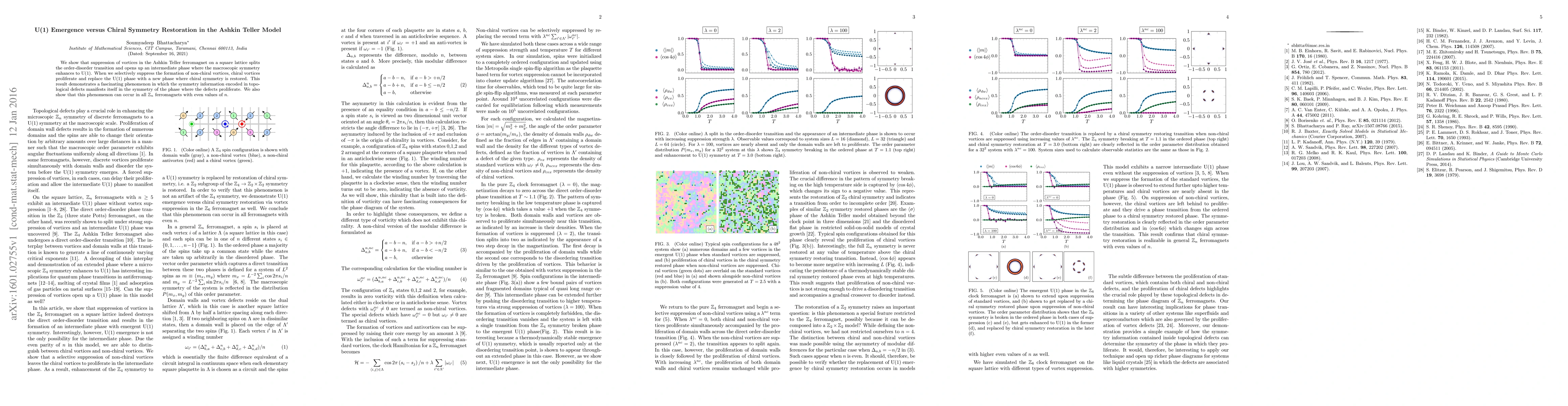 We show that suppression of vortices in the Ashkin Teller ferromagnet on a square lattice splits the order-disorder transition and opens up an intermediate phase where the macroscopic symmetry enhances to U(1). When we selectively suppress the formation of non-chiral vortices, chiral vortices proliferate and replace the U(1) phase with a new phase where chiral symmetry is restored. This result demonstrates a fascinating phenomenon in which the symmetry information encoded in topological defects manifests itself in the symmetry of the phase where the defects proliferate. We also show that this phenomenon can occur in all $\mathbb{Z}_n$ ferromagnets with even values of $n$.