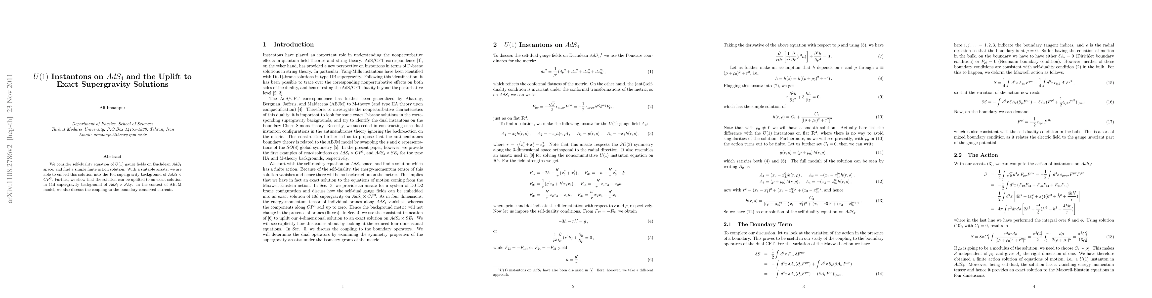 We consider self-duality equation of U(1) gauge fields on Euclidean AdS_4 space, and find a simple finite action solution. With a suitable ansatz, we are able to embed this solution into the 10d supergravity background of AdS_4\times CP^3. Further, we show that the solution can be uplifted to an exact solution in 11d supergravity background of AdS_4\times SE_7.
