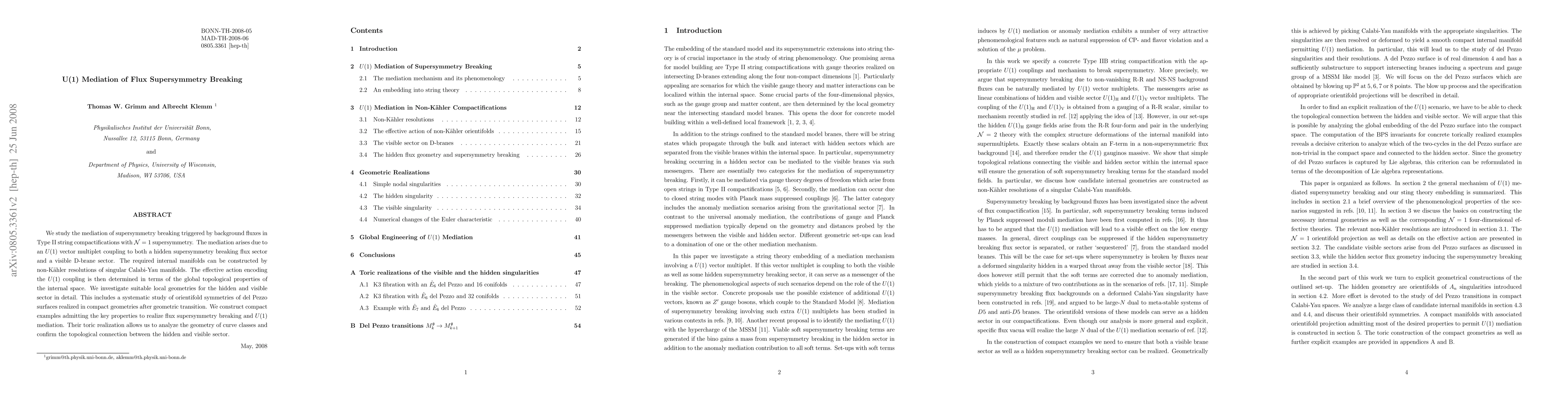 We study the mediation of supersymmetry breaking triggered by background fluxes in Type II string compactifications with N=1 supersymmetry. The mediation arises due to an U(1) vector multiplet coupling to both a hidden supersymmetry breaking flux sector and a visible D-brane sector. The required internal manifolds can be constructed by non-Kaehler resolutions of singular Calabi-Yau manifolds. The effective action encoding the U(1) coupling is then determined in terms of the global topological properties of the internal space. We investigate suitable local geometries for the hidden and visible sector in detail. This includes a systematic study of orientifold symmetries of del Pezzo surfaces realized in compact geometries after geometric transition. We construct compact examples admitting the key properties to realize flux supersymmetry breaking and U(1) mediation. Their toric realization allows us to analyze the geometry of curve classes and confirm the topological connection between the hidden and visible sector.