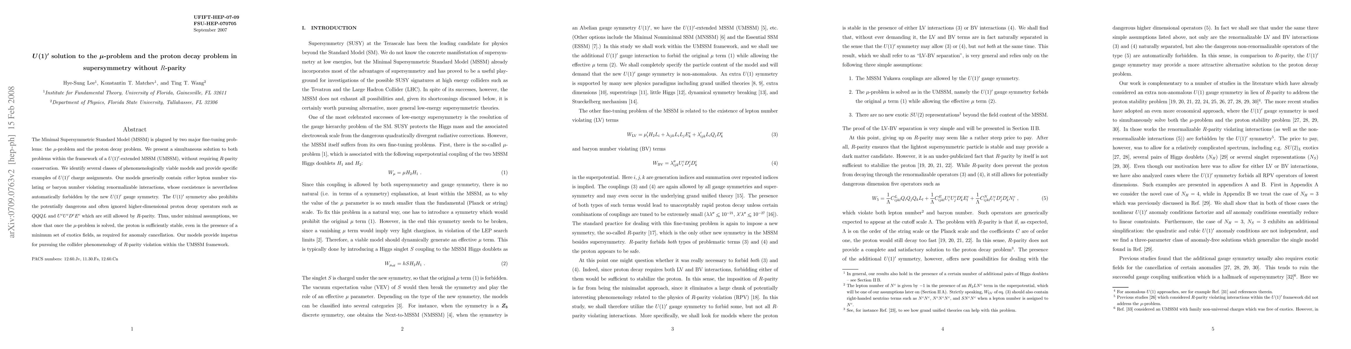 The paper proposes a U(1)' solution to both the mu-problem and proton decay problem in the MSSM without R-parity, presenting viable models with specific U(1)' charge assignments. It demonstrates that the U(1)' symmetry naturally forbids harmful interactions and operators, ensuring proton stability and mu-term generation, thus encouraging collider phenomenology of R-parity violation within the UMSSM framework.