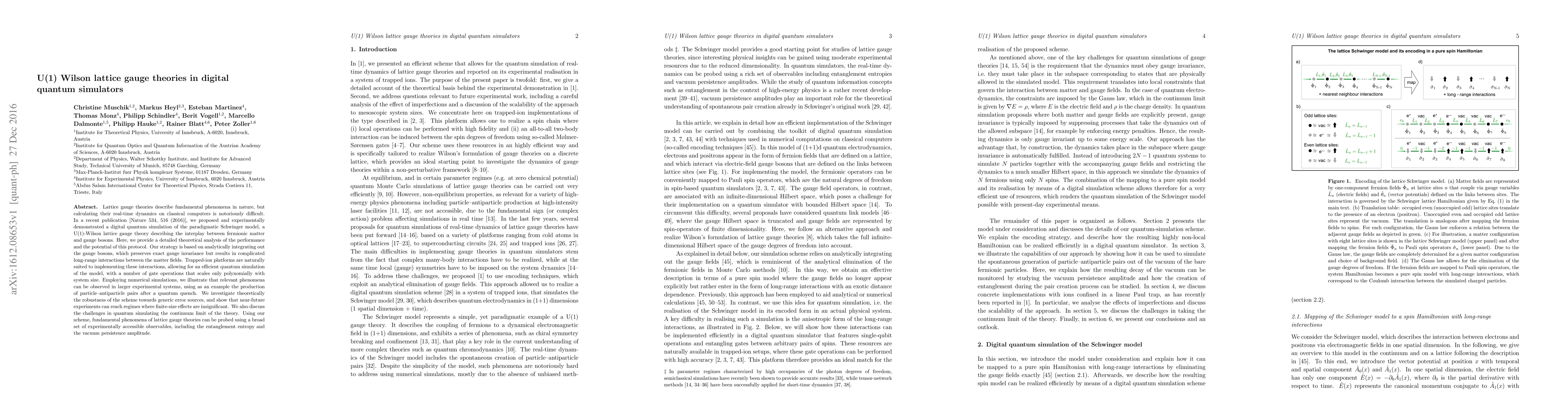 This paper presents a detailed theoretical analysis of a digital quantum simulation protocol for U(1) Wilson lattice gauge theories, demonstrating its potential for studying fundamental phenomena using trapped-ion platforms. The authors show that the protocol can efficiently simulate the Schwinger model, observing phenomena like particle-antiparticle pair production, and discuss its robustness and scalability for future experiments.