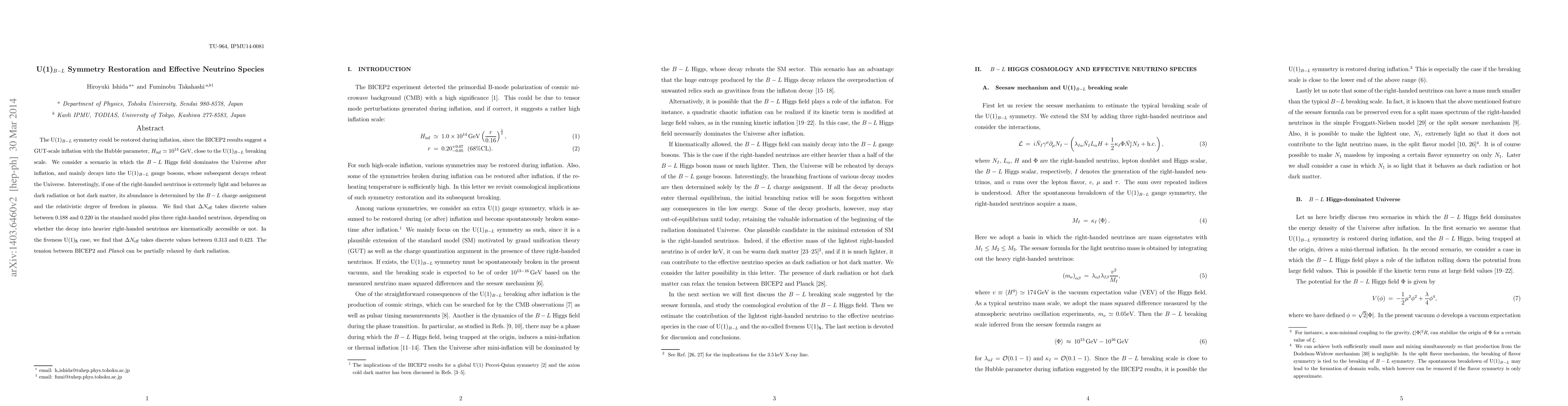This paper explores the restoration of U(1)$_{B-L}$ symmetry during inflation, suggesting it could occur at the GUT scale, and examines the implications for effective neutrino species, finding that $\Delta N_{\rm eff}$ takes discrete values depending on the $B-L$ charge assignment and the presence of extremely light right-handed neutrinos, potentially alleviating tensions between BICEP2 and Planck data.