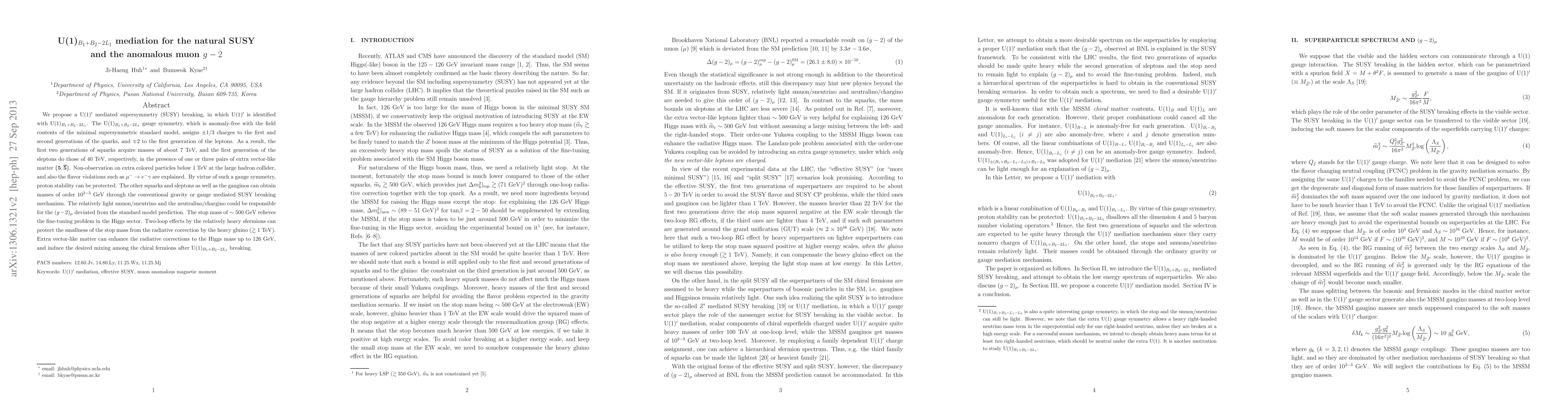 We propose a U(1)^\prime mediated supersymmetry (SUSY) breaking, in which U(1)^\prime is identified with U(1)_{B_1+B_2-2L_1}. The U(1)_{B_1+B_2-2L_1} gauge symmetry, which is anomaly-free with the field contents of the minimal supersymmetric standard model, assigns \pm 1/3 charges to the first and second generations of the quarks, and \mp 2 to the first generation of the leptons. As a result, the first two generations of squarks acquire masses of about 7 TeV, and the first generation of the sleptons do those of 40 TeV, respectively, in the presence of one or three pairs of extra vector-like matter {{\bf 5},\bar{\bf 5}}. Non-observation on extra colored particles below 1 TeV at the large hadron collider, and also the flavor violations such as \mu^-\rightarrow e^-\gamma are explained. By virtue of such a gauge symmetry, proton stability can be protected. The other squarks and sleptons as well as the gauginos can obtain masses of order 10^{2-3} GeV through the conventional gravity or gauge mediated SUSY breaking mechanism. The relatively light smuon/sneutrino and the neutralino/chargino could be responsible for the (g-2)_\mu deviated from the standard model prediction. The stop mass of \sim 500 GeV relieves the fine-tuning problem in the Higgs sector. Two-loop effects by the relatively heavy sfermions can protect the smallness of the stop mass from the radiative correction by the heavy gluino (\gtrsim 1 TeV). Extra vector-like matter can enhance the radiative corrections to the Higgs mass up to 126 GeV, and induce the desired mixing among the chiral fermions after U(1)_{B_1+B_2-2L_1} breaking.