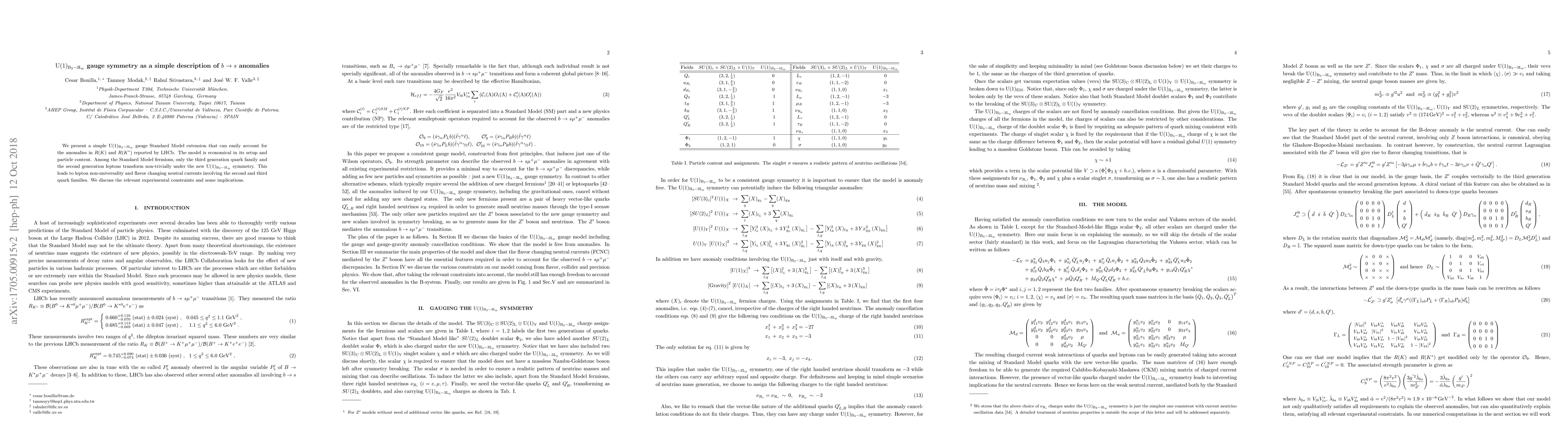 We present a simple $U(1)_{B_3-3L_\mu}$ gauge Standard Model extension that can easily account for the anomalies in $R(K)$ and $R(K^*)$ reported by LHCb. The model is economical in its setup and particle content. Among the Standard Model fermions, only the third generation quark family and the second generation leptons transform non-trivially under the new $U(1)_{B_3-3L_\mu}$ symmetry. This leads to lepton non-universality and flavor changing neutral currents involving the second and third quark families. We discuss the relevant experimental constraints and some implications.