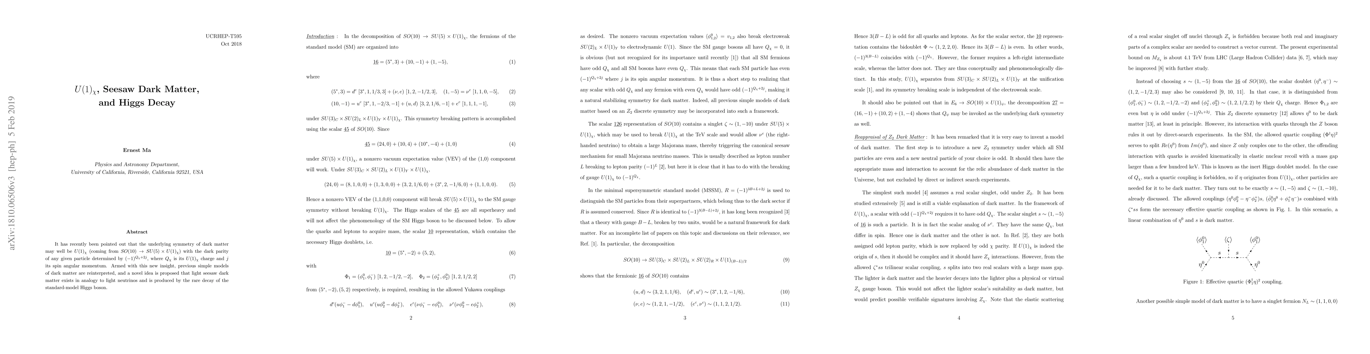 This research proposes that dark matter's underlying symmetry is $U(1)_\chi$, derived from $SO(10) \to SU(5) \times U(1)_\chi$, and introduces the concept of seesaw dark matter produced via rare Higgs boson decay.