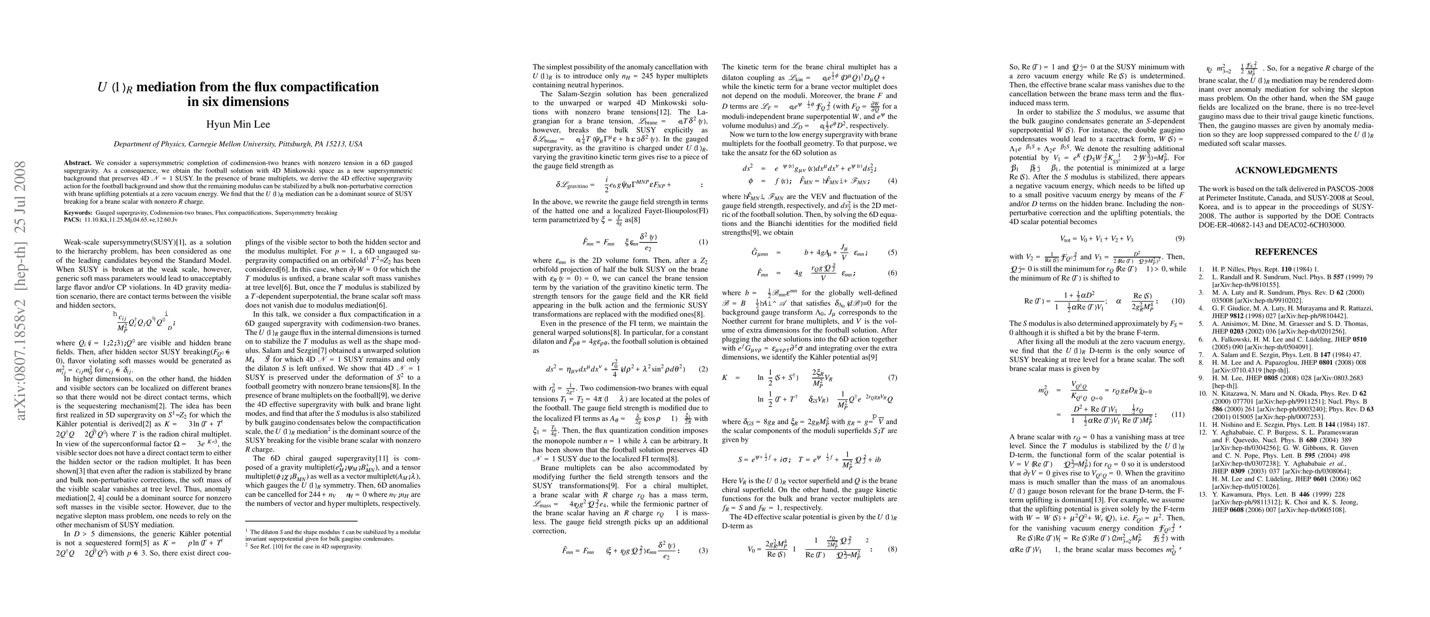 We consider a supersymmetric completion of codimension-two branes with nonzero tension in a 6D gauged supergravity. As a consequence, we obtain the football solution with 4D Minkowski space as a new supersymmetric background that preserves 4D N=1 SUSY. In the presence of brane multiplets, we derive the 4D effective supergravity action for the football background and show that the remaining modulus can be stabilized by a bulk non-perturbative correction with brane uplifting potentials at a zero vacuum energy. We find that the U(1)_R mediation can be a dominant source of SUSY breaking for a brane scalar with nonzero R charge.