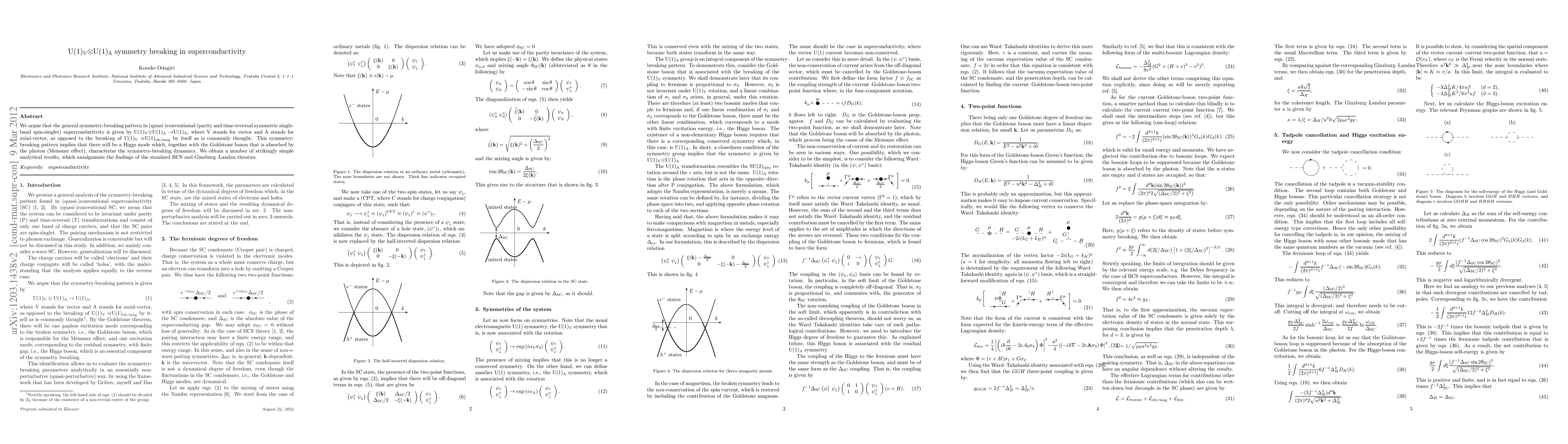 This paper proposes that in (quasi-)conventional superconductivity, the symmetry breaking occurs via U(1)_V x U(1)_A -> U(1)_A, leading to a Higgs mode and a Goldstone boson absorbed by the photon. This contrasts with the commonly held belief of U(1)_V symmetry breaking alone.