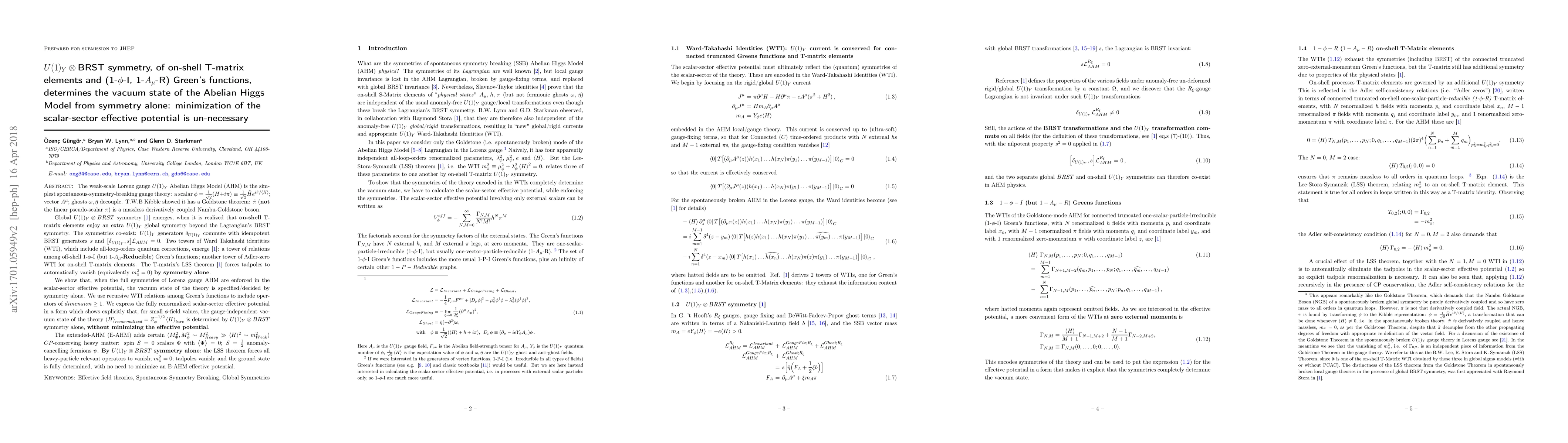 The weak-scale $U(1)_{Y}$ Abelian Higgs Model (AHM) is the spontaneous-symmetry-breaking gauge theory of a complex scalar $\phi = \frac{1}{\sqrt{2}}(H + i \pi)$ and a vector $A_{\mu}$. Global $U(1)_{Y}\otimes BRST$ symmetry emerges: when it is realized that on-shell T-matrix elements enjoy an extra $U(1)_{Y}$ global symmetry beyond the Lagragian's BRST symmetry. The symmetries co-exist: $U(1)_{Y}$ generators $\delta_{U(1)_Y}$ commute with BRST generators s and $[\delta_{U(1)_Y},s]{\cal L} = 0$. Two towers of Ward Takahashi identities (WTI), which include all-loop-orders quantum corrections, emerge: a tower of relations among off-shell 1-$\phi$-I (but 1-$A_{\mu}$-Reducible) Green's functions; another tower of Adler-zero WTI for on-shell T-matrix elements. The T-matrix's LSS theorem forces tadpoles to automatically vanish (equivalently $m^{2}_{\pi} = 0$) by symmetry alone. We show that, when the full symmetries of Lorenz gauge AHM are enforced on the scalar-sector effective potential, the vacuum state of the theory is specified/decided by symmetry alone. We use recursive WTI relations among Green's functions to include opeators of dimension $\geq 1$. We express the fully renormalized scalar-sector effective potential in a form which shows explicitly that, for small scalar field values, the gauge-independent vacuum state of the theory $\langle H\rangle_{renormalized} = Z^{1/2}_{\phi}\langle H\rangle_{bare}$ is determined by $U(1)_{Y}\otimes BRST$ symmetry alone, without minimizing the effective potential.