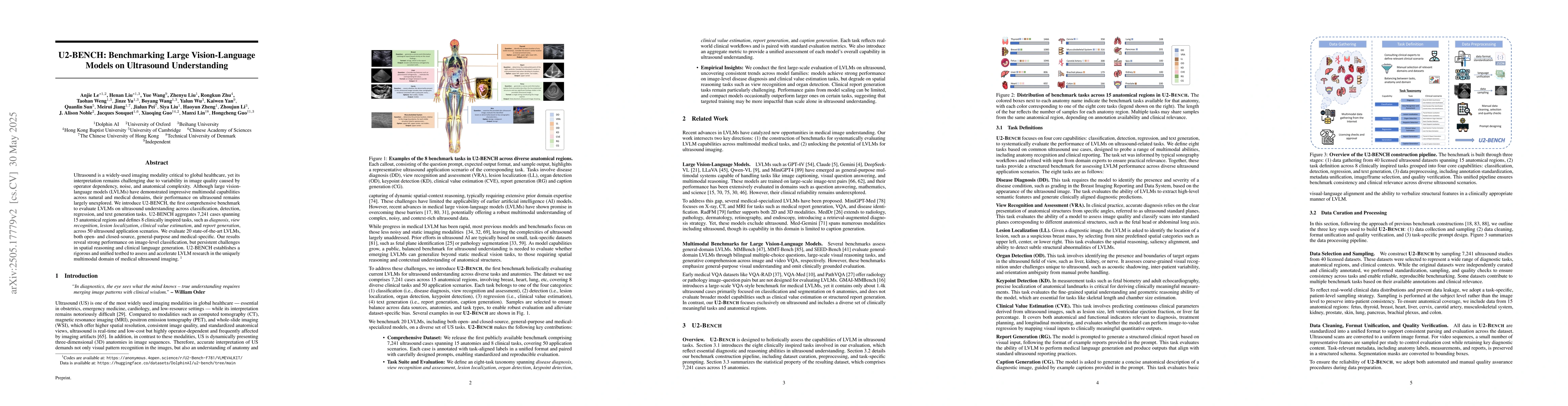 This paper introduces U2-BENCH, a comprehensive benchmark for evaluating large vision-language models on ultrasound understanding across various tasks, revealing strong performance in image-level classification but challenges in spatial reasoning and clinical language generation.