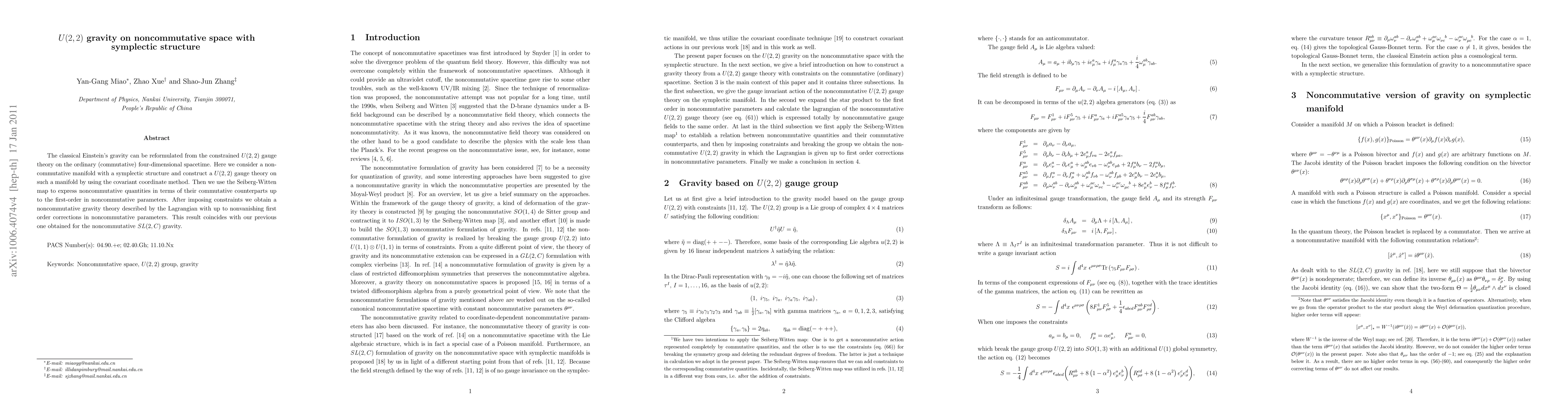 This paper reformulates classical Einstein's gravity as a U(2,2) gauge theory on a noncommutative spacetime with a symplectic structure, employing the covariant coordinate method and Seiberg-Witten map to derive a noncommutative gravity theory with first-order corrections. The results align with previous findings on noncommutative SL(2,C) gravity.