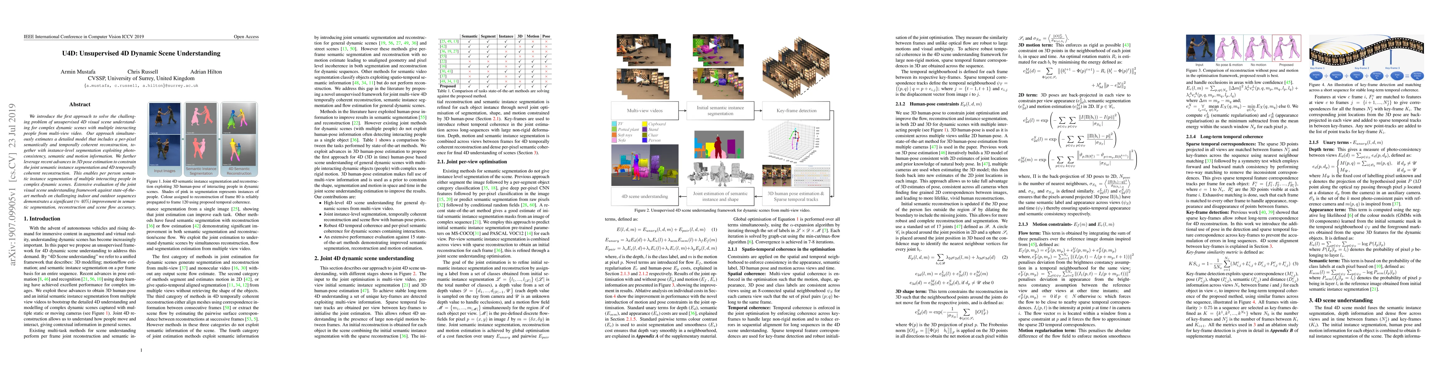 The paper presents an unsupervised method for 4D dynamic scene understanding in complex, multi-view videos, achieving per-pixel reconstruction and instance-level segmentation through photo-consistency, semantic, and motion information. The method shows a 40% improvement in semantic segmentation, reconstruction, and scene flow accuracy compared to state-of-the-art techniques.