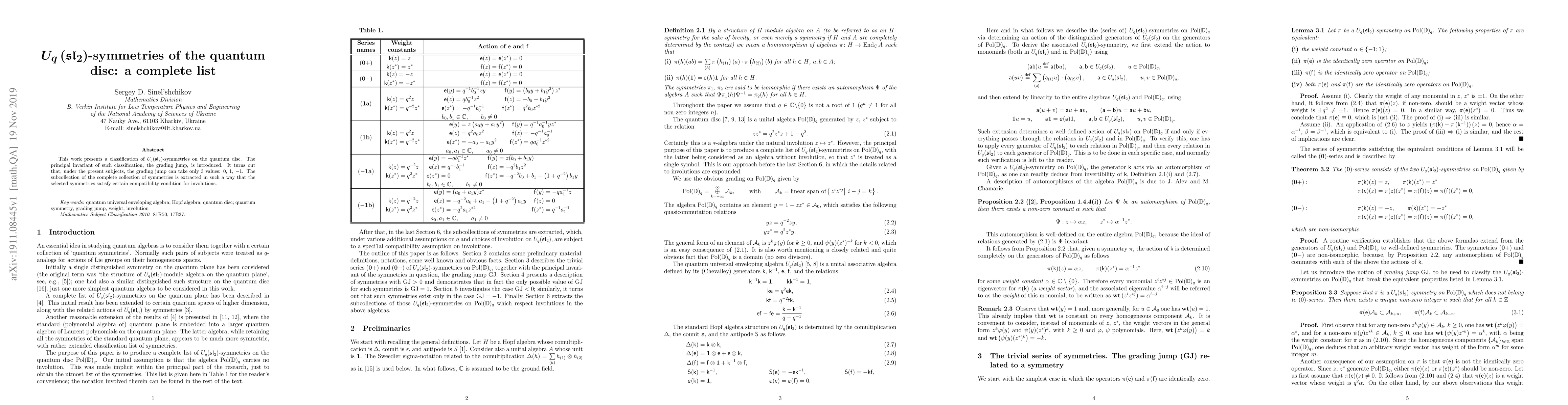 This work presents a classification of $U_q(\mathfrak{sl}_2)$-symmetries on the quantum disc. The principal invariant of such classification, the grading jump, is introduced. It turns out that, under the present subjects, the grading jump can take only 3 values: $0$, $1$, $-1$. The subcollection of the complete collection of symmetries is extracted in such a way that the selected symmetries satisfy certain compatibility condition for involutions.