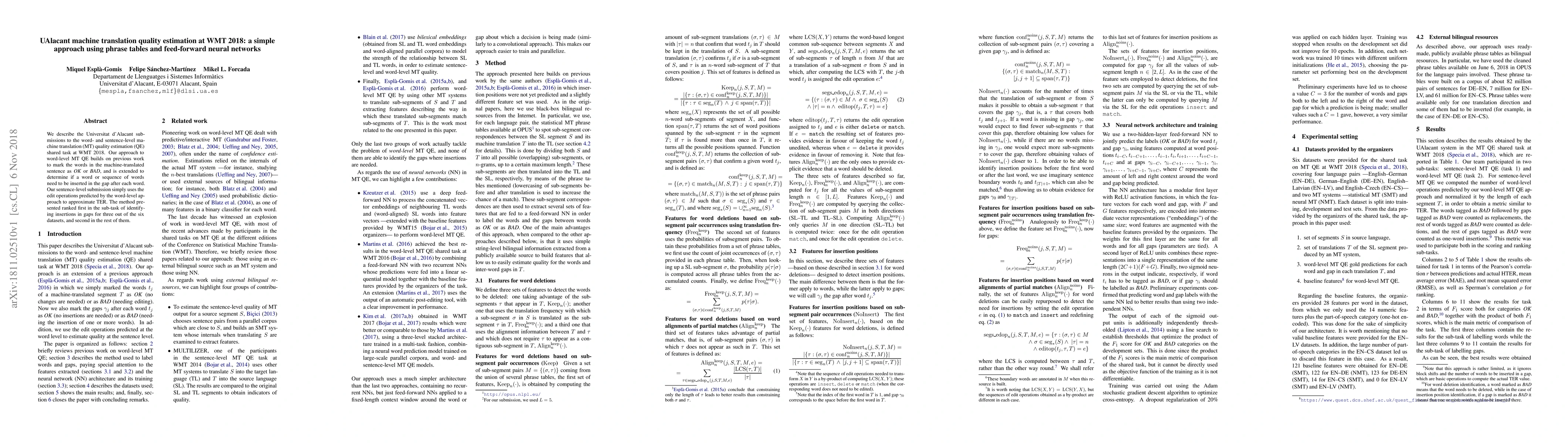 The research uses phrase tables and feed-forward neural networks for machine translation quality estimation (QE) at WMT 2018, marking words in the machine-translated sentence as 'OK' or 'BAD', and determining if a word or sequence of words needs insertion in the gap after each word. The sentence-level submission approximates TER using the predicted edit operations.