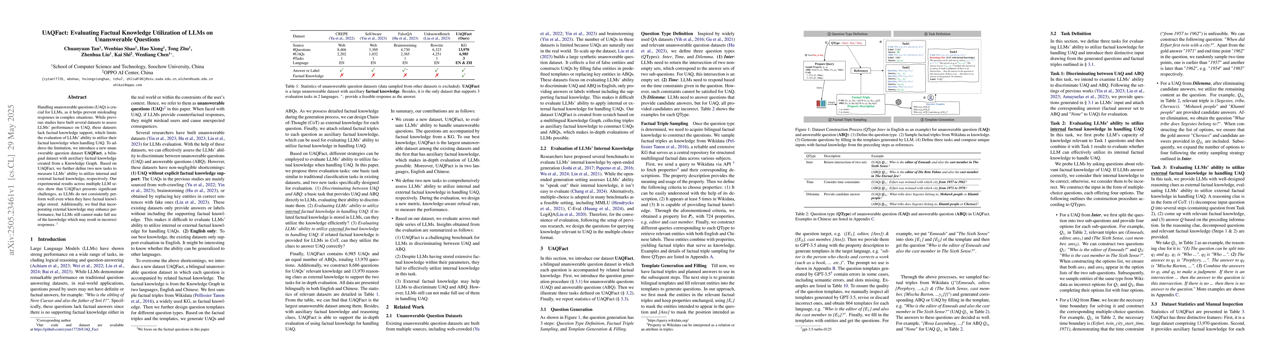 The research introduces UAQFact, a bilingual dataset with auxiliary factual knowledge from a Knowledge Graph, to evaluate LLMs' ability to handle unanswerable questions (UAQ) and utilize factual knowledge. Two new tasks are defined: discriminating UAQ from answerable questions (ABQ) and assessing the use of internal and external factual knowledge.