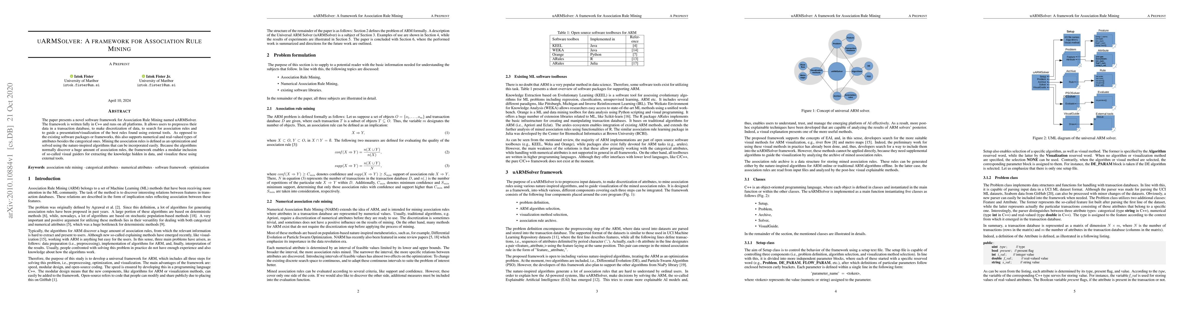 uARMSolver is a C++ framework for Association Rule Mining that supports numerical and categorical attributes, offers optimization using nature-inspired algorithms and visualizers for extracting knowledge from data.
