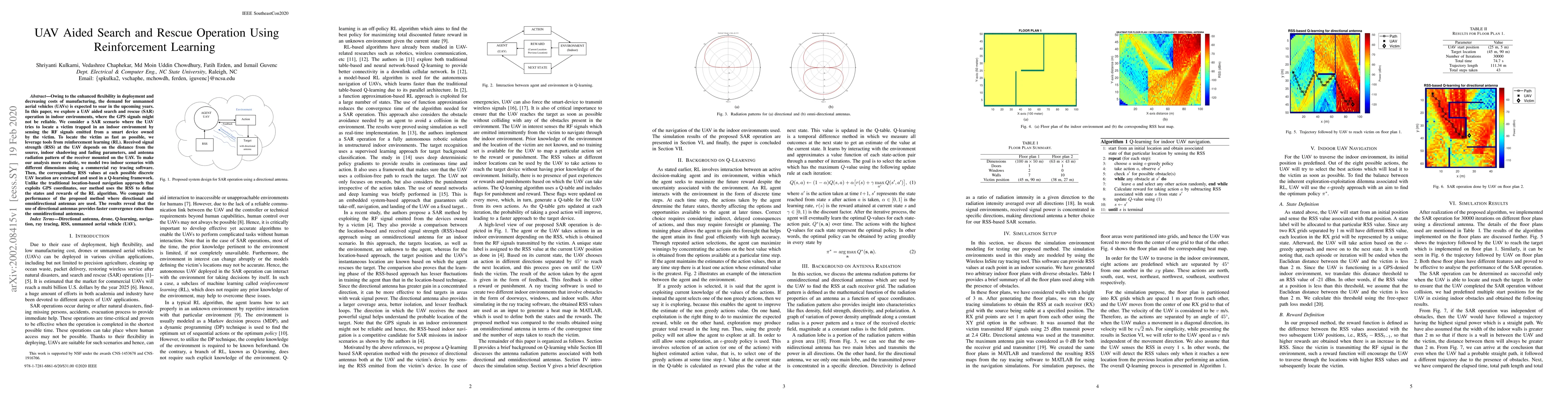 This paper investigates a UAV-assisted search and rescue operation in indoor environments using reinforcement learning to locate a victim via RF signals. The study employs Q-learning with received signal strength as a state-reward mechanism, demonstrating faster convergence with directional antennas compared to omnidirectional ones.