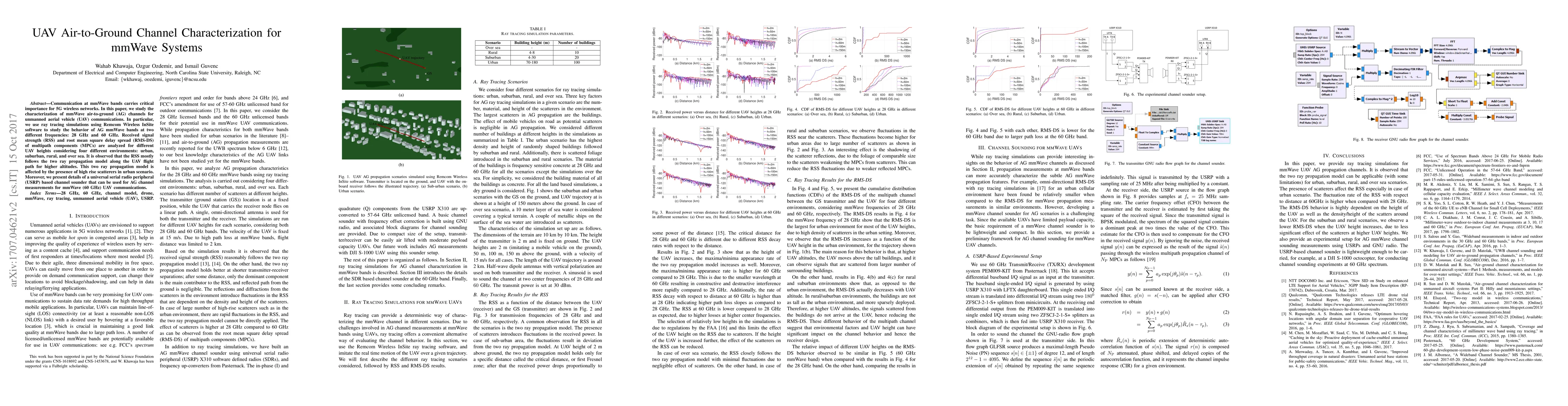 This paper characterizes mmWave air-to-ground channels for UAV communications using ray tracing simulations at 28 GHz and 60 GHz, analyzing RSS and RMS-DS across various environments. The study reveals a two-ray propagation model for higher UAV altitudes, influenced by urban high-rise scatterers.