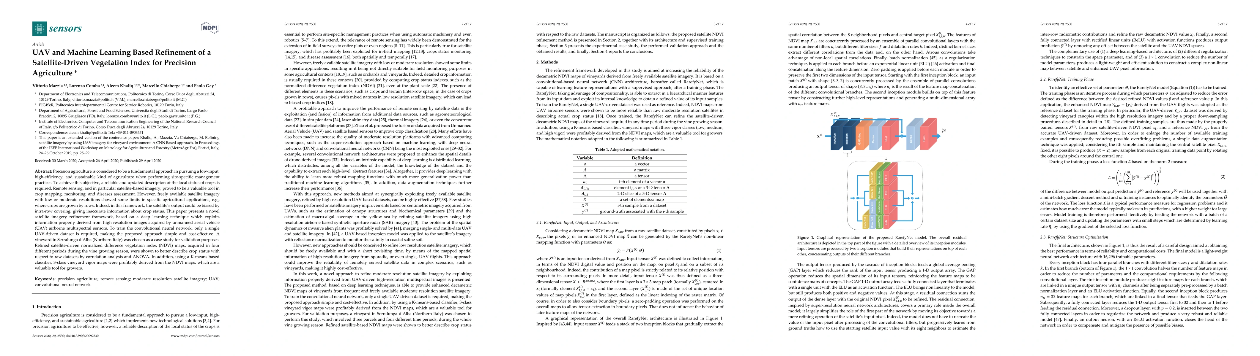 This paper proposes a refined satellite imagery framework using UAV-derived high-resolution multispectral images and machine learning to improve precision agriculture. The refined normalized difference vegetation index (NDVI) maps better describe crop status, validated through correlation analysis and ANOVA in a vineyard case study.