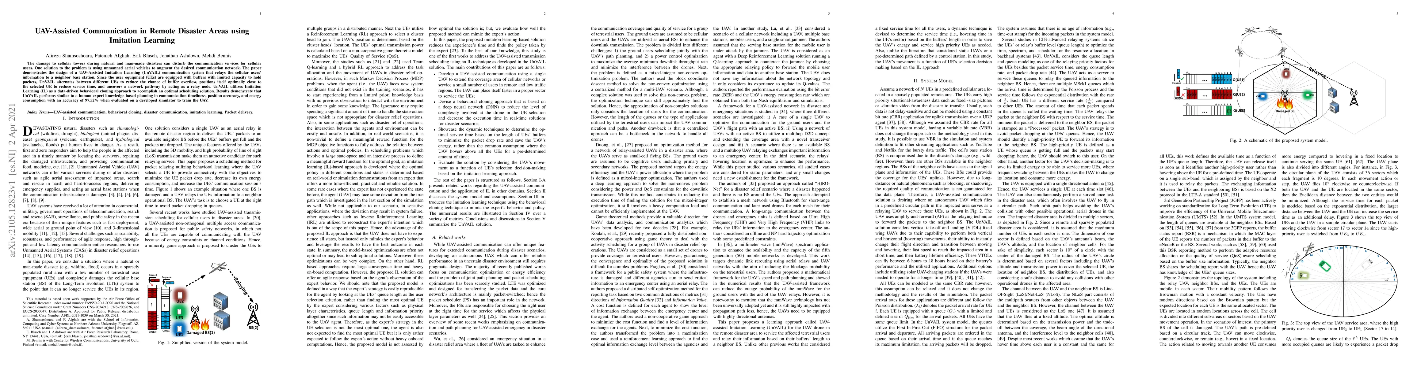 The damage to cellular towers during natural and man-made disasters can disturb the communication services for cellular users. One solution to the problem is using unmanned aerial vehicles to augment the desired communication network. The paper demonstrates the design of a UAV-Assisted Imitation Learning (UnVAIL) communication system that relays the cellular users' information to a neighbor base station. Since the user equipment (UEs) are equipped with buffers with limited capacity to hold packets, UnVAIL alternates between different UEs to reduce the chance of buffer overflow, positions itself optimally close to the selected UE to reduce service time, and uncovers a network pathway by acting as a relay node. UnVAIL utilizes Imitation Learning (IL) as a data-driven behavioral cloning approach to accomplish an optimal scheduling solution. Results demonstrate that UnVAIL performs similar to a human expert knowledge-based planning in communication timeliness, position accuracy, and energy consumption with an accuracy of 97.52% when evaluated on a developed simulator to train the UAV.