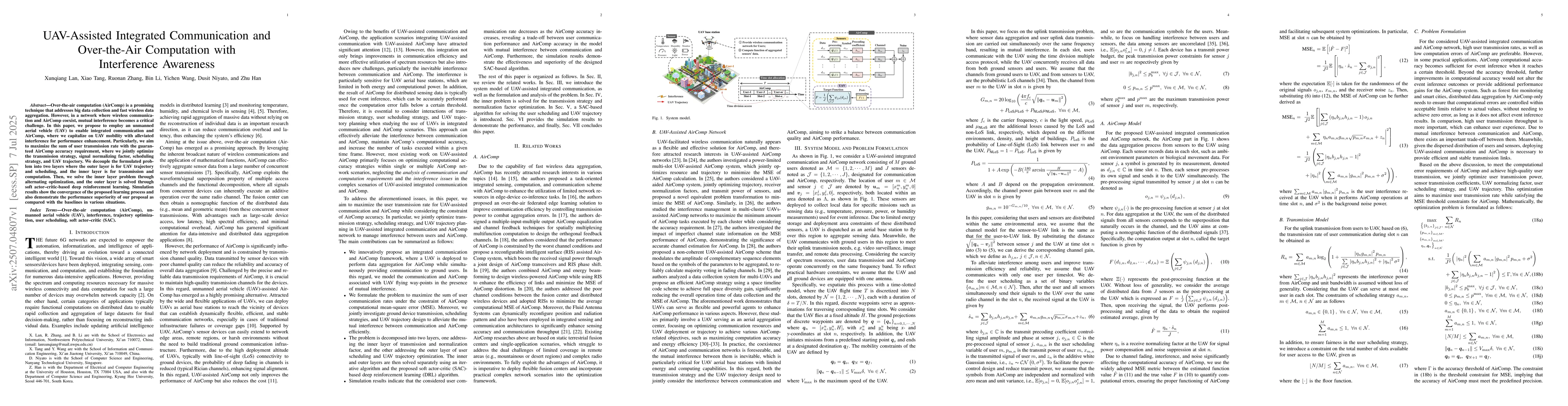 Over the air computation (AirComp) is a promising technique that addresses big data collection and fast wireless data aggregation. However, in a network where wireless communication and AirComp coexist, mutual interference becomes a critical challenge. In this paper, we propose to employ an unmanned aerial vehicle (UAV) to enable integrated communication and AirComp, where we capitalize on UAV mobility with alleviated interference for performance enhancement. Particularly, we aim to maximize the sum of user transmission rate with the guaranteed AirComp accuracy requirement, where we jointly optimize the transmission strategy, signal normalizing factor, scheduling strategy, and UAV trajectory. We decouple the formulated problem into two layers where the outer layer is for UAV trajectory and scheduling, and the inner layer is for transmission and computation. Then, we solve the inner layer problem through alternating optimization, and the outer layer is solved through soft actor critic based deep reinforcement learning. Simulation results show the convergence of the proposed learning process and also demonstrate the performance superiority of our proposal as compared with the baselines in various situations.