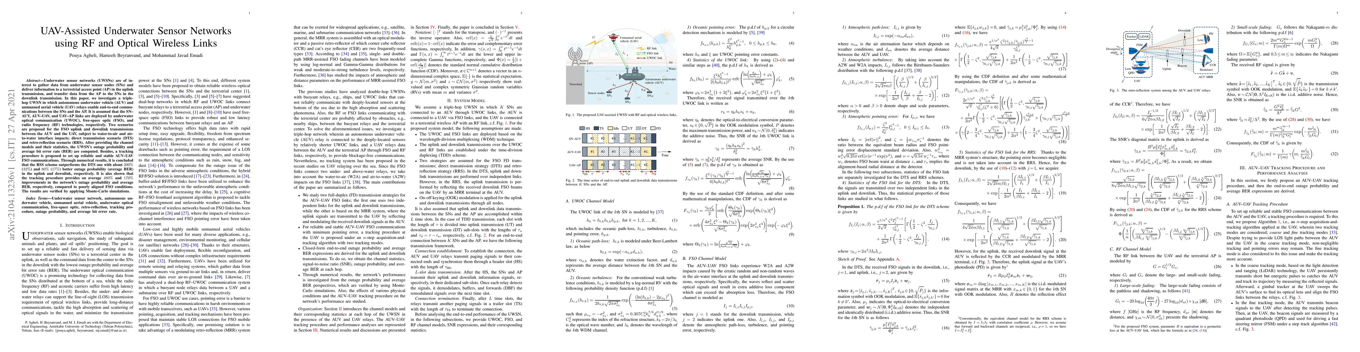 This paper explores a triple-hop underwater sensor network (UWSN) utilizing autonomous underwater vehicles (AUVs) and unmanned aerial vehicles (UAVs) for relaying communications between underwater sensor nodes (SNs) and a terrestrial access point (AP). The proposed scenarios for FSO uplink and downlink transmissions show that the retro-reflection scenario significantly outperforms the direct transmission scenario, while a tracking procedure enhances network reliability.