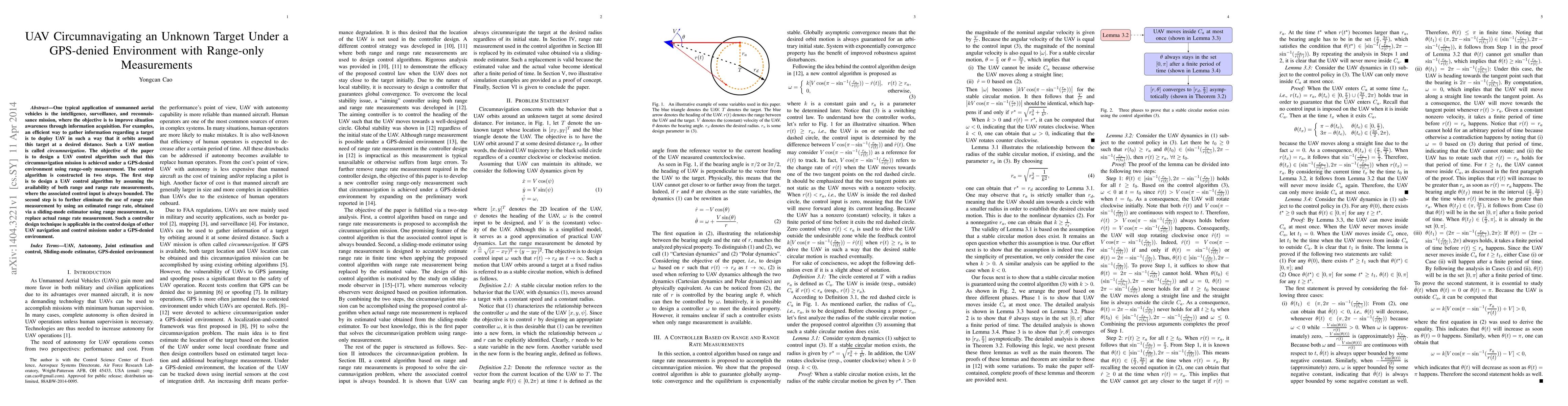 One typical application of unmanned aerial vehicles is the intelligence, surveillance, and reconnaissance mission, where the objective is to improve situation awareness through information acquisition. For examples, an efficient way to gather information regarding a target is to deploy UAV in such a way that it orbits around this target at a desired distance. Such a UAV motion is called circumnavigation. The objective of the paper is to design a UAV control algorithm such that this circumnavigation mission is achieved under a GPS-denied environment using range-only measurement. The control algorithm is constructed in two steps. The first step is to design a UAV control algorithm by assuming the availability of both range and range rate measurements, where the associated control input is always bounded. The second step is to further eliminate the use of range rate measurement by using an estimated range rate, obtained via a sliding-mode estimator using range measurement, to replace actual range rate measurement. Such a controller design technique is applicable in the control design of other UAV navigation and control missions under a GPS-denied environment.