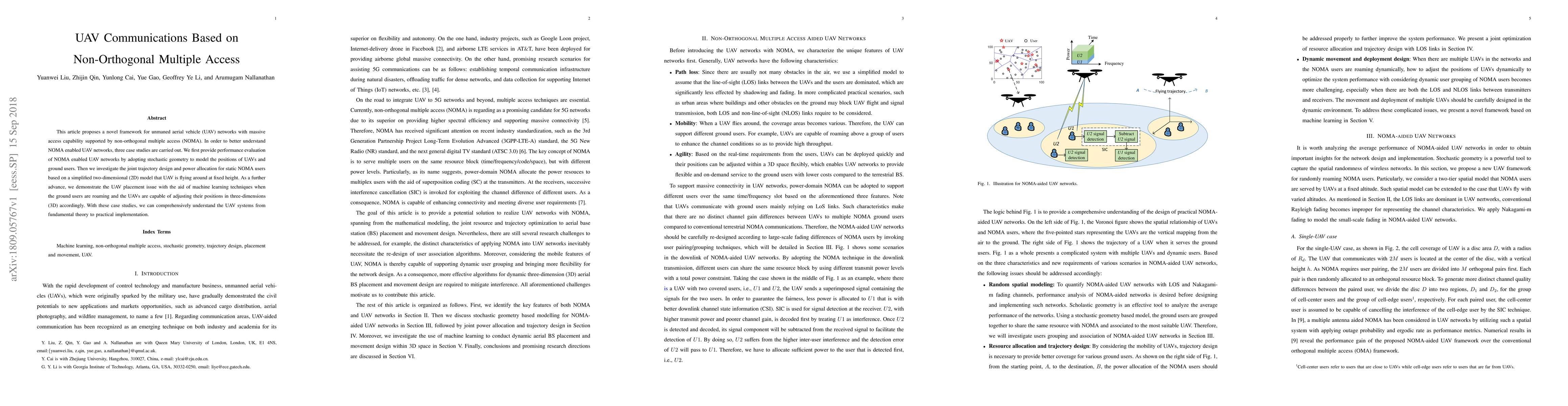 This paper proposes a framework for UAV networks using non-orthogonal multiple access (NOMA) to support massive access. It evaluates NOMA performance via stochastic geometry, explores joint trajectory design and power allocation in a 2D model, and uses machine learning for dynamic 3D UAV placement.