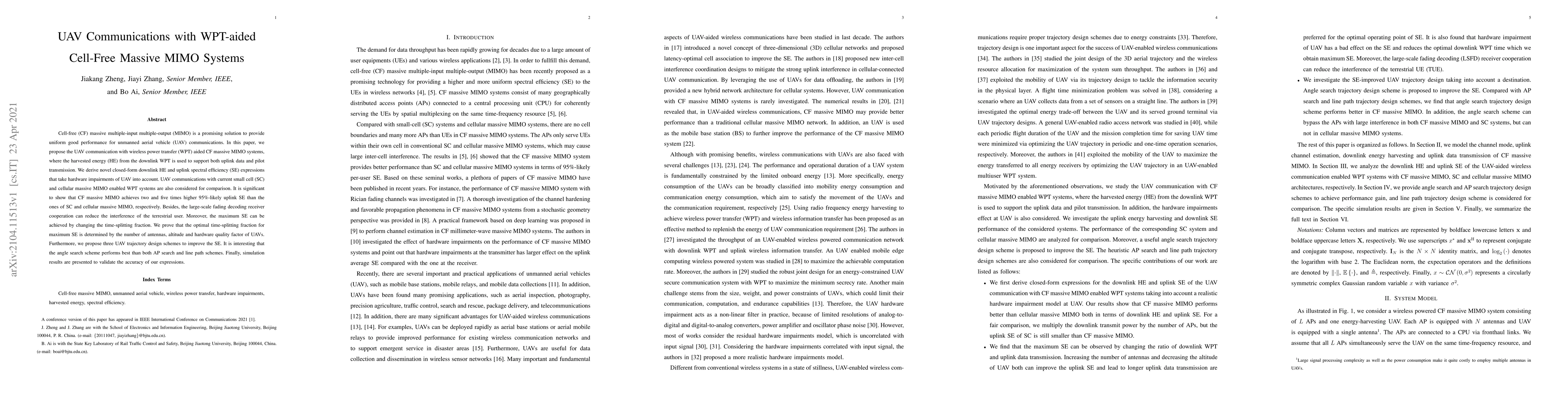 This paper proposes a UAV communication system using wireless power transfer (WPT) in cell-free massive MIMO, achieving significantly higher uplink spectral efficiency compared to small cell and cellular massive MIMO systems. The study derives closed-form expressions for harvested energy and spectral efficiency, considering UAV hardware impairments, and proposes optimal time-splitting fractions and trajectory designs for enhanced performance.