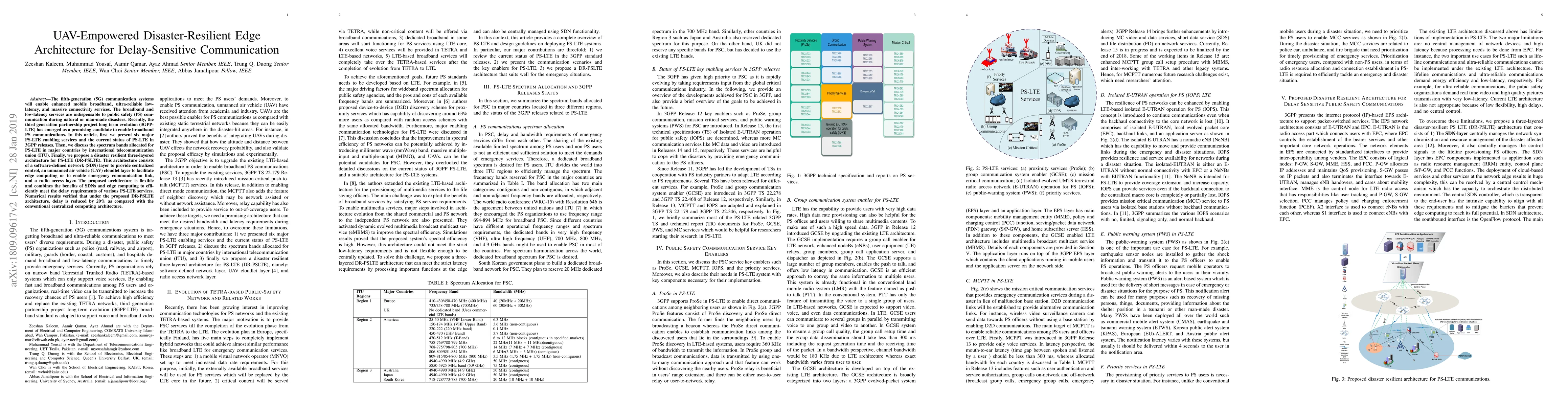 This paper presents a three-layered disaster-resilient architecture for public safety LTE (PS-LTE) communication, integrating software-defined networking and UAV-based edge computing to enhance delay-sensitive services. Numerical results show a 20% reduction in delay compared to conventional centralized architectures.