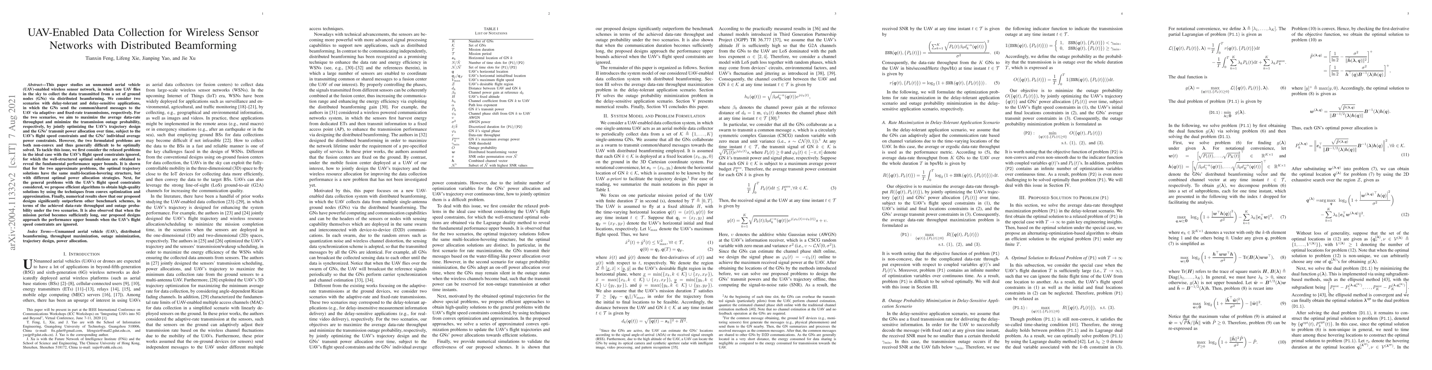This paper investigates UAV-enabled wireless sensor networks using distributed beamforming to collect data from ground nodes. It optimizes UAV trajectory and ground node transmit power to maximize throughput and minimize outage probability under delay-tolerant and delay-sensitive scenarios, respectively, employing convex optimization and approximation techniques. Numerical results show significant performance improvements over benchmark schemes.