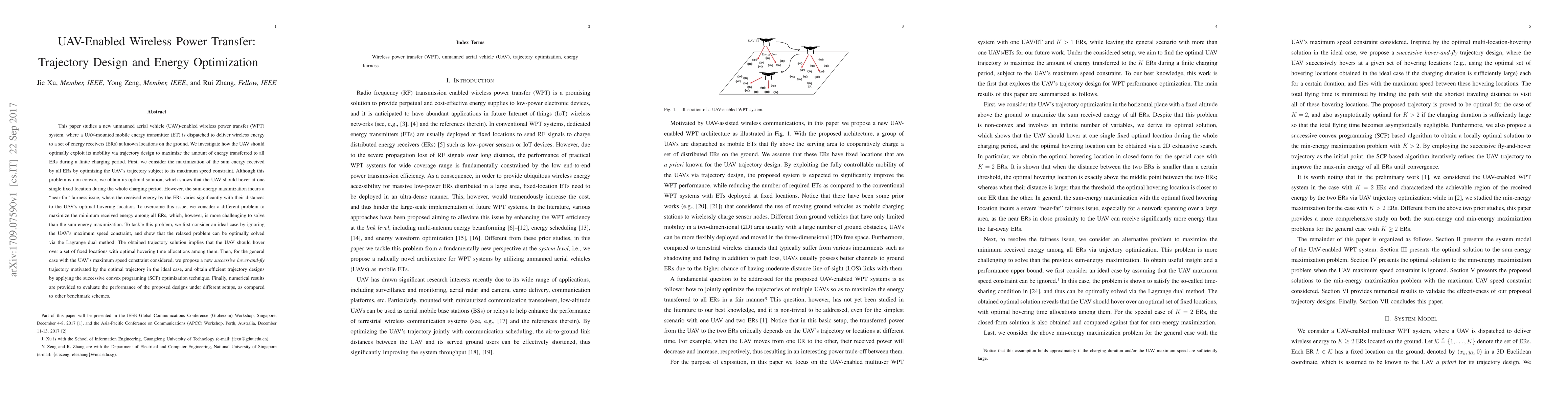 This paper explores UAV-enabled wireless power transfer systems, focusing on optimizing the UAV's trajectory to maximize energy delivery to ground receivers. The study finds that hovering at a single fixed location maximizes total energy but creates fairness issues, leading to a new approach that maximizes minimum energy received while considering UAV speed constraints.