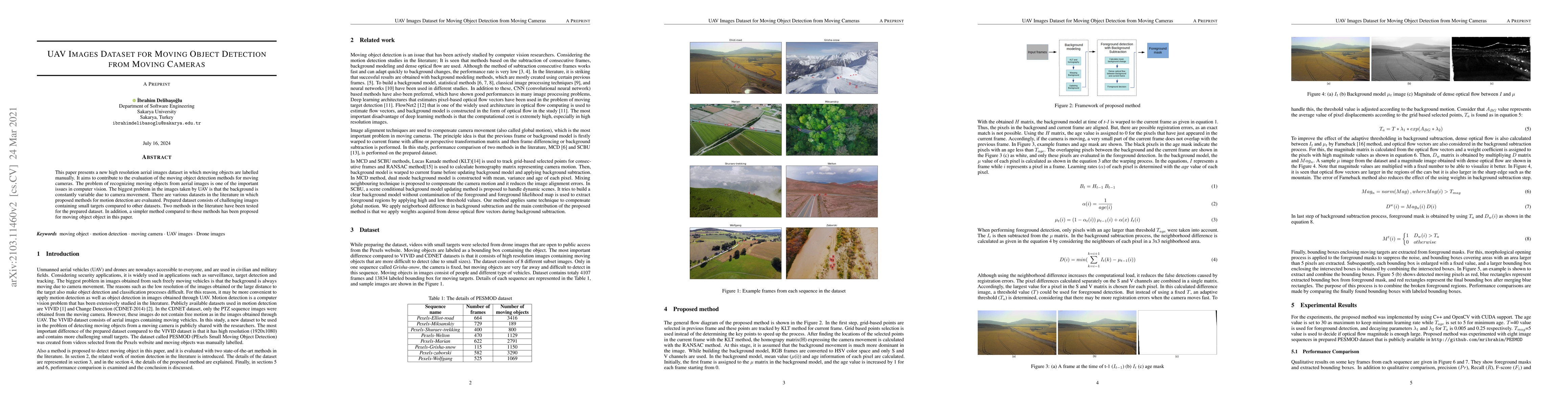 This paper introduces a high-resolution UAV images dataset with manually labelled moving objects, designed to evaluate detection methods for moving cameras. The dataset includes challenging images with small targets, and tests existing methods while proposing a simpler alternative for moving object detection.