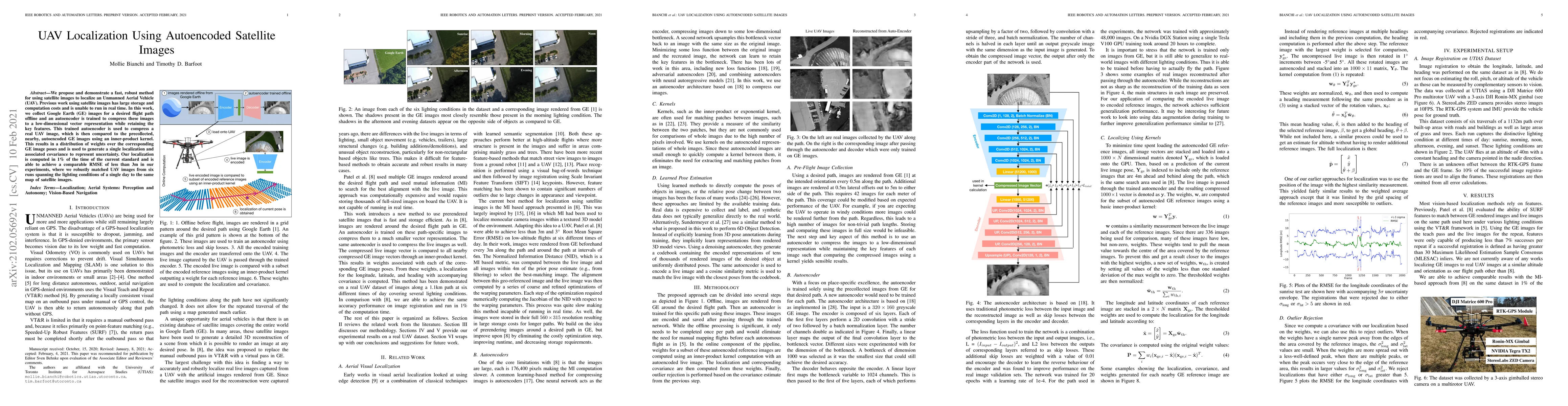 We propose and demonstrate a fast, robust method for using satellite images to localize an Unmanned Aerial Vehicle (UAV). Previous work using satellite images has large storage and computation costs and is unable to run in real time. In this work, we collect Google Earth (GE) images for a desired flight path offline and an autoencoder is trained to compress these images to a low-dimensional vector representation while retaining the key features. This trained autoencoder is used to compress a real UAV image, which is then compared to the precollected, nearby, autoencoded GE images using an inner-product kernel. This results in a distribution of weights over the corresponding GE image poses and is used to generate a single localization and associated covariance to represent uncertainty. Our localization is computed in 1% of the time of the current standard and is able to achieve a comparable RMSE of less than 3m in our experiments, where we robustly matched UAV images from six runs spanning the lighting conditions of a single day to the same map of satellite images.