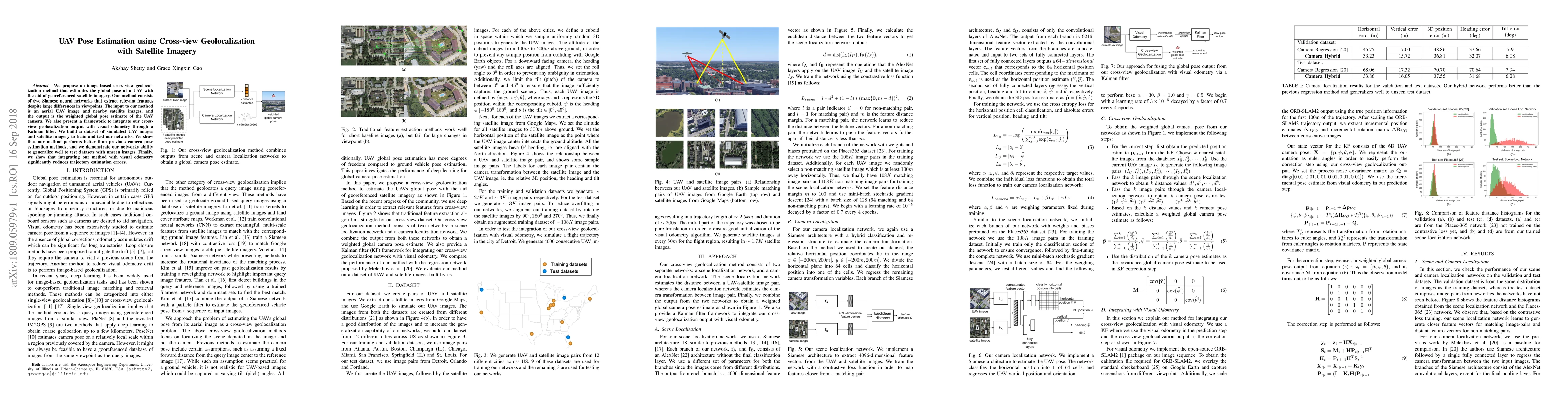 This paper proposes an image-based cross-view geolocalization method using satellite imagery to estimate UAV pose, leveraging two Siamese neural networks for feature extraction. The method integrates with visual odometry via a Kalman filter, demonstrating improved performance and generalization over previous methods.