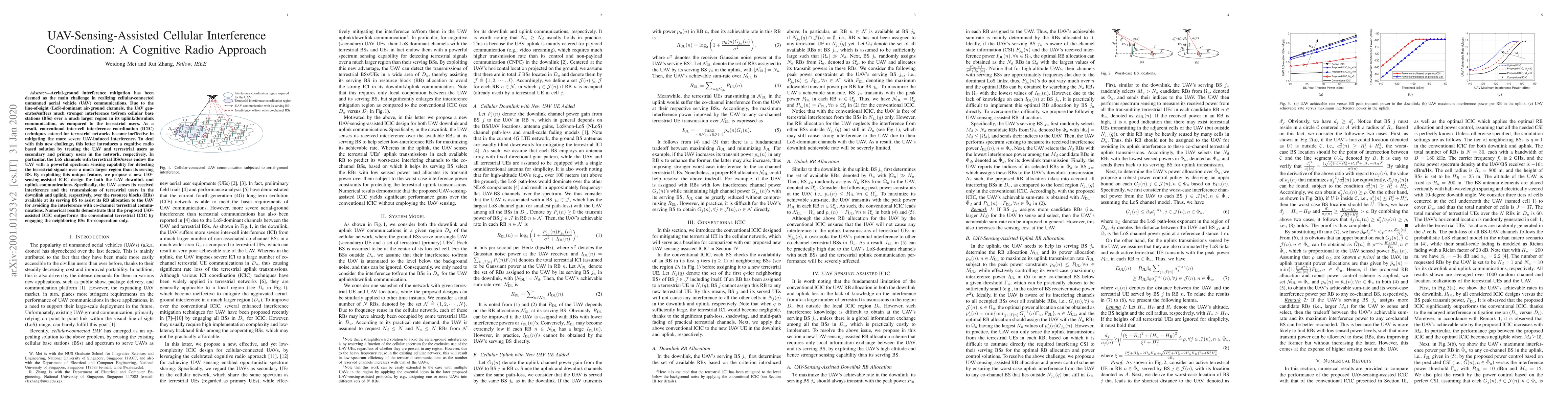 This paper proposes a cognitive radio approach for UAV-sensing-assisted cellular interference coordination to mitigate aerial-ground interference in UAV communications. The UAV leverages its superior spectrum sensing capability to detect terrestrial signals and assist in inter-cell interference coordination, significantly outperforming conventional terrestrial interference coordination methods.