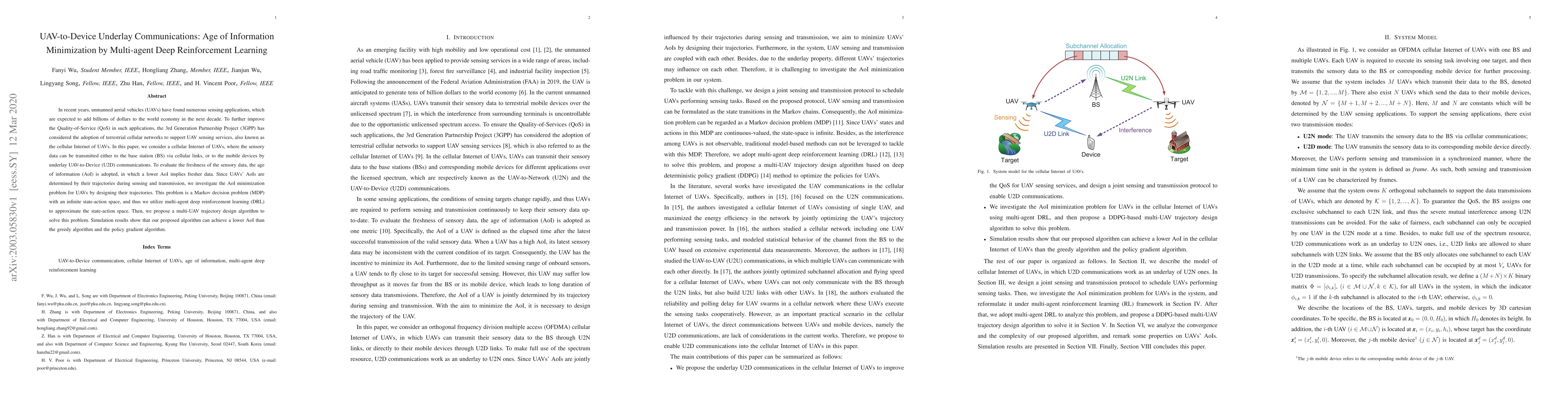 This paper explores minimizing the age of information (AoI) in UAV-to-Device (U2D) underlay communications within a cellular Internet of UAVs framework using multi-agent deep reinforcement learning. The proposed multi-UAV trajectory design algorithm outperforms greedy and policy gradient algorithms in achieving lower AoI.