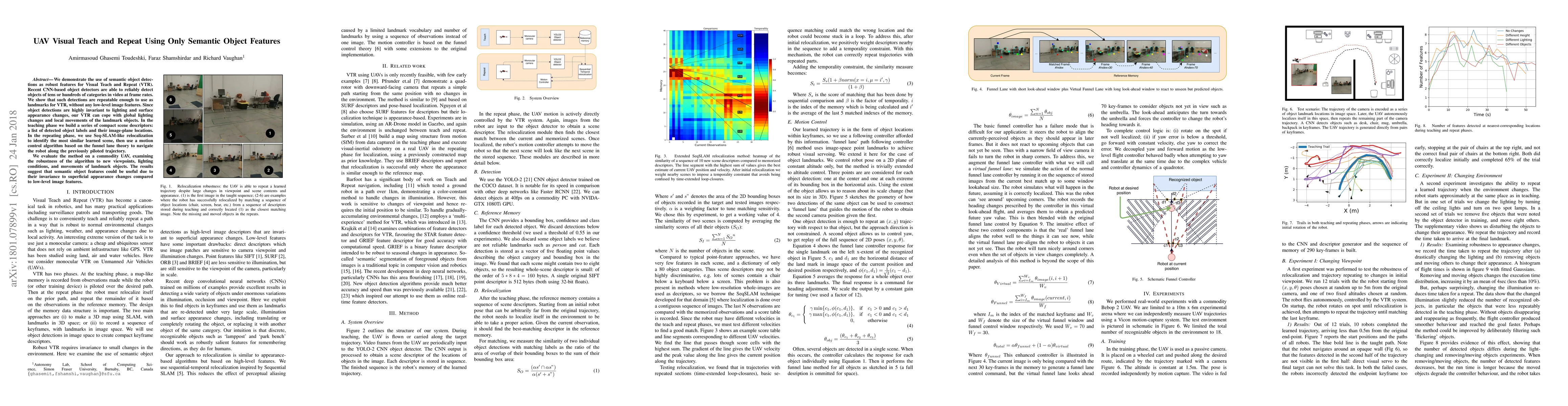 We demonstrate the use of semantic object detections as robust features for Visual Teach and Repeat (VTR). Recent CNN-based object detectors are able to reliably detect objects of tens or hundreds of categories in a video at frame rates. We show that such detections are repeatable enough to use as landmarks for VTR, without any low-level image features. Since object detections are highly invariant to lighting and surface appearance changes, our VTR can cope with global lighting changes and local movements of the landmark objects. In the teaching phase, we build a series of compact scene descriptors: a list of detected object labels and their image-plane locations. In the repeating phase, we use Seq-SLAM-like relocalization to identify the most similar learned scene, then use a motion control algorithm based on the funnel lane theory to navigate the robot along the previously piloted trajectory. We evaluate the method on a commodity UAV, examining the robustness of the algorithm to new viewpoints, lighting conditions, and movements of landmark objects. The results suggest that semantic object features could be useful due to their invariance to superficial appearance changes compared to low-level image features.