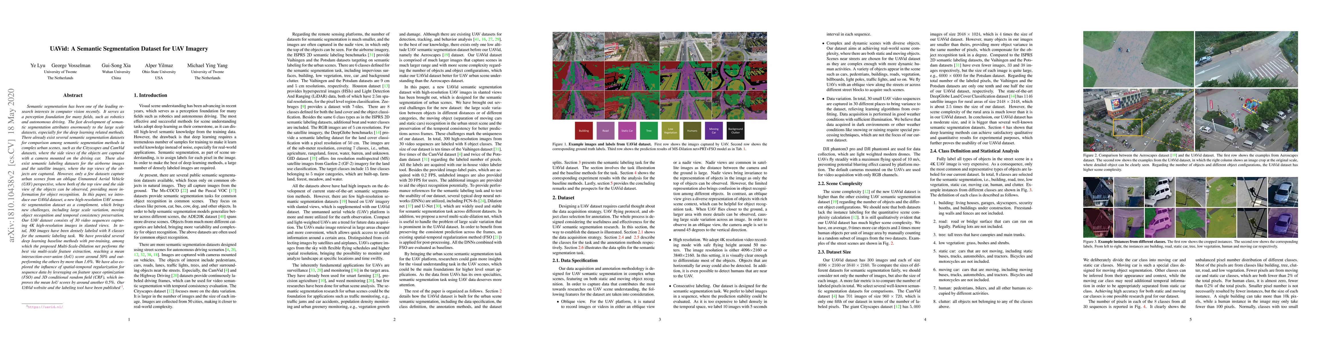 UAVid introduces a new high-resolution semantic segmentation dataset for oblique Unmanned Aerial Vehicle (UAV) imagery, offering both top and side views of urban objects. The dataset includes 300 densely labeled images across 8 classes, aiming to address challenges like large scale variation and moving object recognition.
