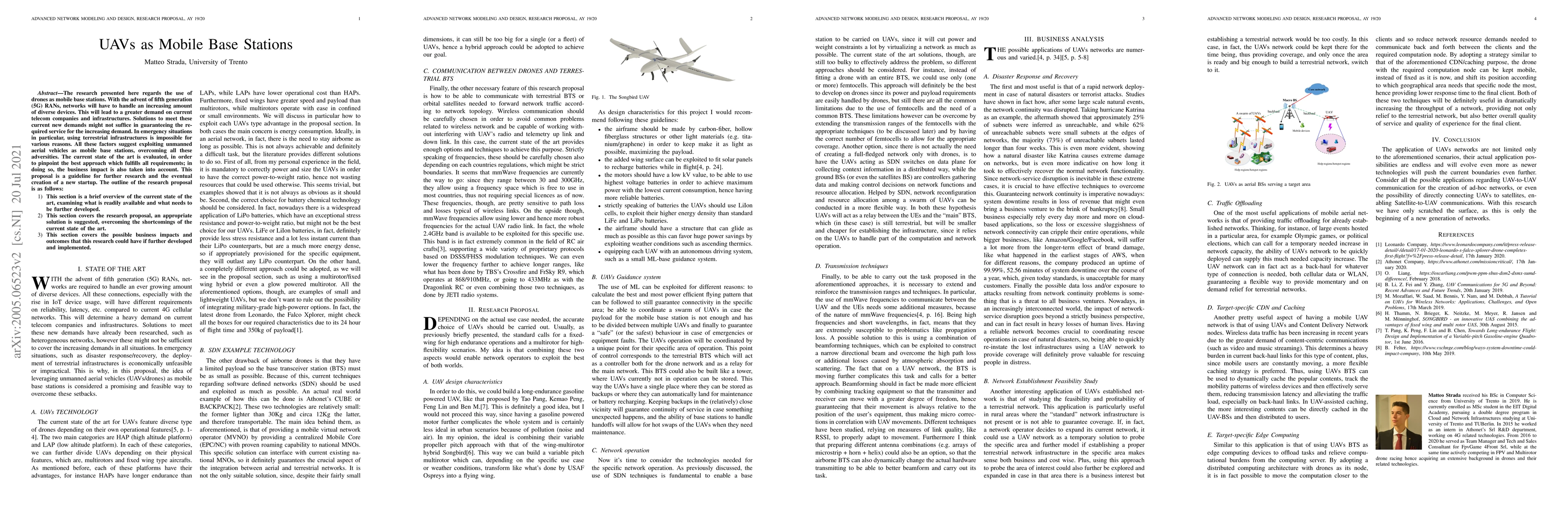 The research presented here has been conducted as part of professor Fabrizion Granelli's course "Advanced Network Modeling and Design" at UniTn and regards the use of drones as mobile base stations. With the advent of fifth generation (5G) RANs, networks will have to handle an increasing amount of diverse devices. This will lead to a greater demand on current telecom companies and infrastructures. Solutions to meet these current new demands might not suffice in guaranteeing the required service for the increasing demand. In emergency situations in particular, using terrestrial infrastructures is impossible for various reasons. All these factors suggest exploiting unmanned aerial vehicles as mobile base stations, overcoming all these adversities. The current state of the art is evaluated, in order to pinpoint the best approach which fulfills all requirements; in doing so, the business impact is also taken into account. This proposal is a guideline for further research and the eventual creation of a new startup. The outline of the research proposal is as follows: 1) This section is a brief overview of the current state of the art, examining what is readily available and what needs to be further developed. 2) This section covers the research proposal, an appropriate solution is suggested, overcoming the shortcomings of the current state of the art. 3) This section covers the possible business impacts and outcomes that this research could have if further developed and implemented.