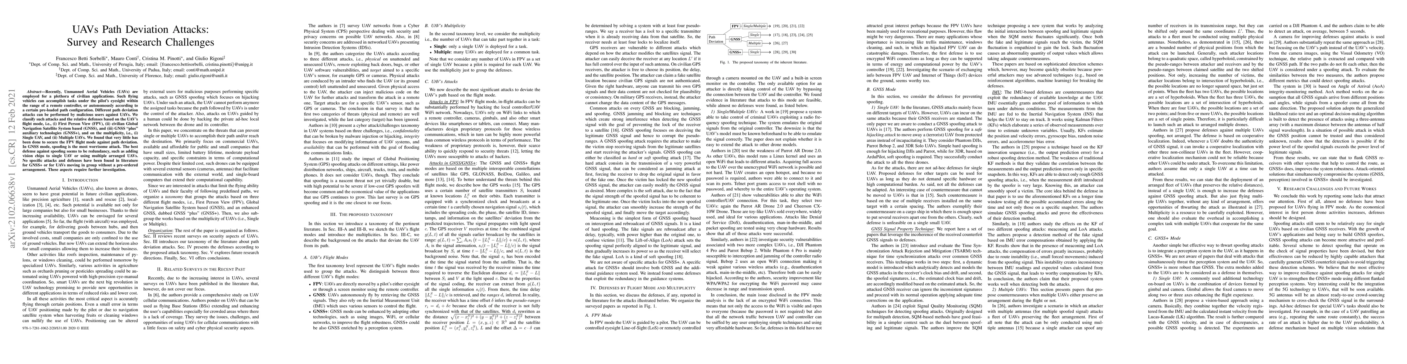 This paper surveys various path deviation attacks on UAVs, categorizing them based on flight modes and attack multiplicity, and highlights the lack of defenses for First Person View mode and coordinated group attacks, emphasizing the need for further research in these areas.
