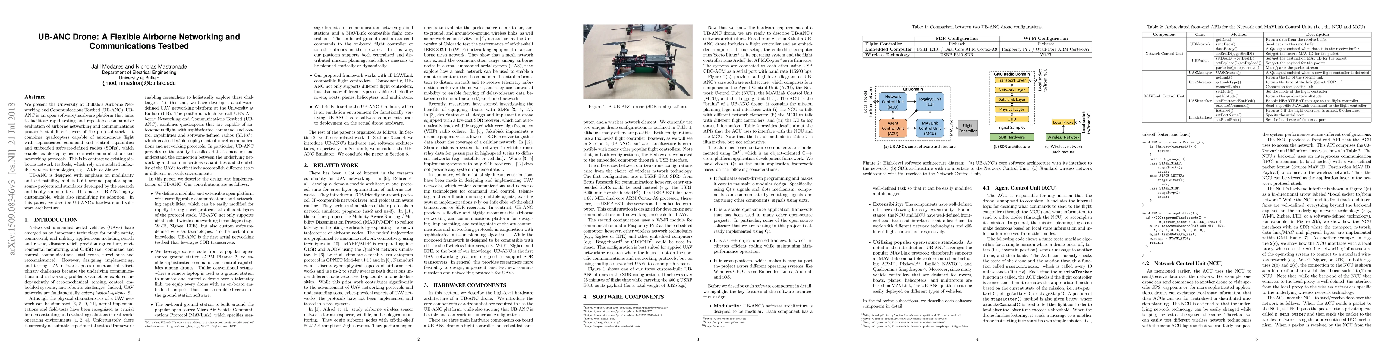 We present the University at Buffalo's Airborne Networking and Communications Testbed (UB-ANC Drone). UB-ANC Drone is an open software/hardware platform that aims to facilitate rapid testing and repeatable comparative evaluation of airborne networking and communications protocols at different layers of the protocol stack. It combines quadcopters capable of autonomous flight with sophisticated command and control capabilities and embedded software-defined radios (SDRs), which enable flexible deployment of novel communications and networking protocols. This is in contrast to existing airborne network testbeds, which rely on standard inflexible wireless technologies, e.g., Wi-Fi or Zigbee. UB-ANC Drone is designed with emphasis on modularity and extensibility, and is built around popular open-source projects and standards developed by the research and hobby communities. This makes UB-ANC Drone highly customizable, while also simplifying its adoption. In this paper, we describe UB-ANC Drone's hardware and software architecture.