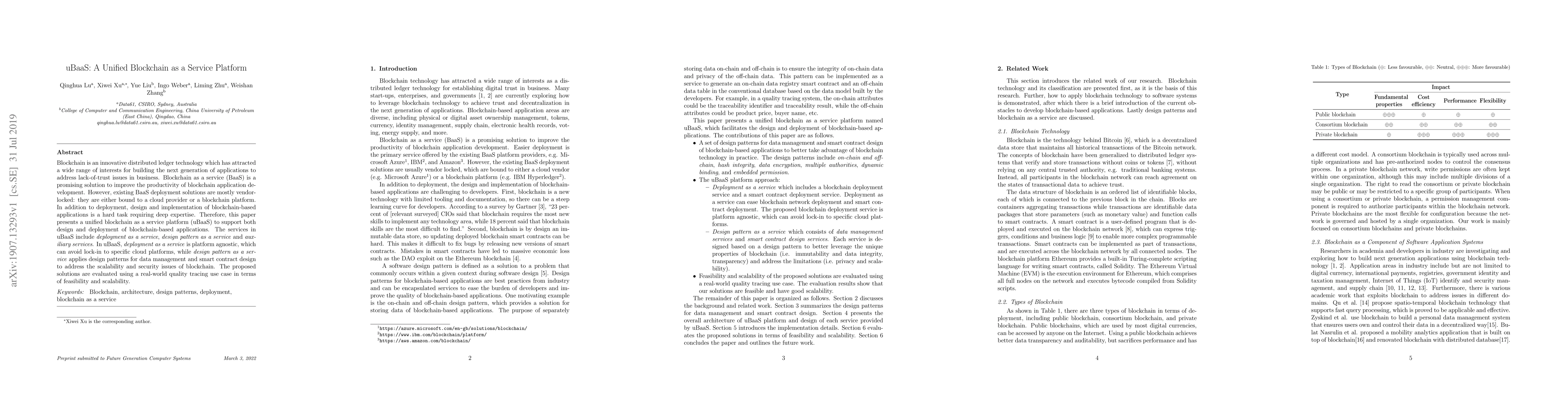 This paper introduces uBaaS, a unified Blockchain as a Service platform that aims to enhance blockchain application development by offering platform-agnostic deployment and design pattern services, thereby avoiding vendor lock-in and addressing scalability and security issues. The platform's effectiveness is demonstrated through a real-world quality tracing use case.
