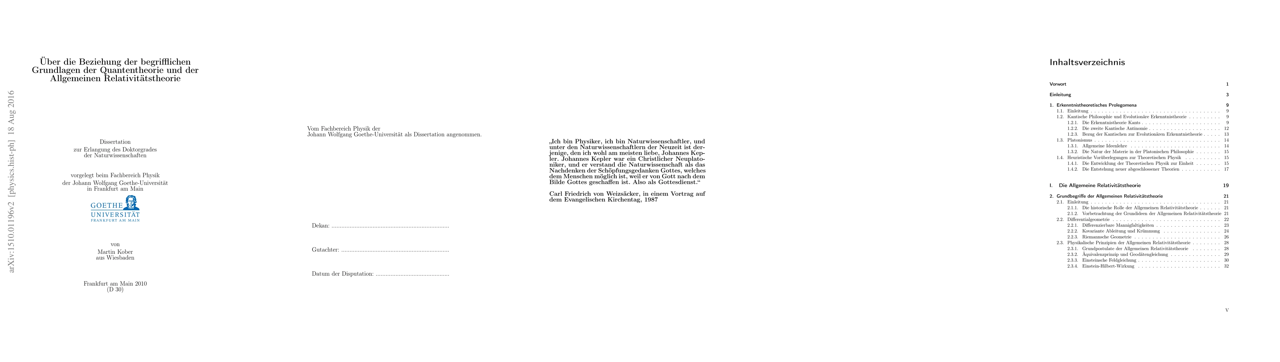 In this dissertation the question of the unification of quantum theory and general relativity is treated. Based on the conceptual structure of these theories and under incorporation of certain ideas from classical philosophy there are formulated arguments for the assertion that these two fundamental theories of nature can only be led to a unification in the framework of a description, in which space-time is not presupposed but constituted by a more fundamental physical reality. Under this precondition an own model to derive the mathematical structure of general relativity from a unified quantum field theory of spinors is developed. In addition the quantum theory of fundamental binary logical alternatives, which has been conceived by Carl Friedrich von Weizs\"acker in the second half of the twentieth century and in which the existence of physical space and his properties is a consequence of quantum theory, is treated elaborately and considered with respect to the question of the unification of quantum theory and general relativity.